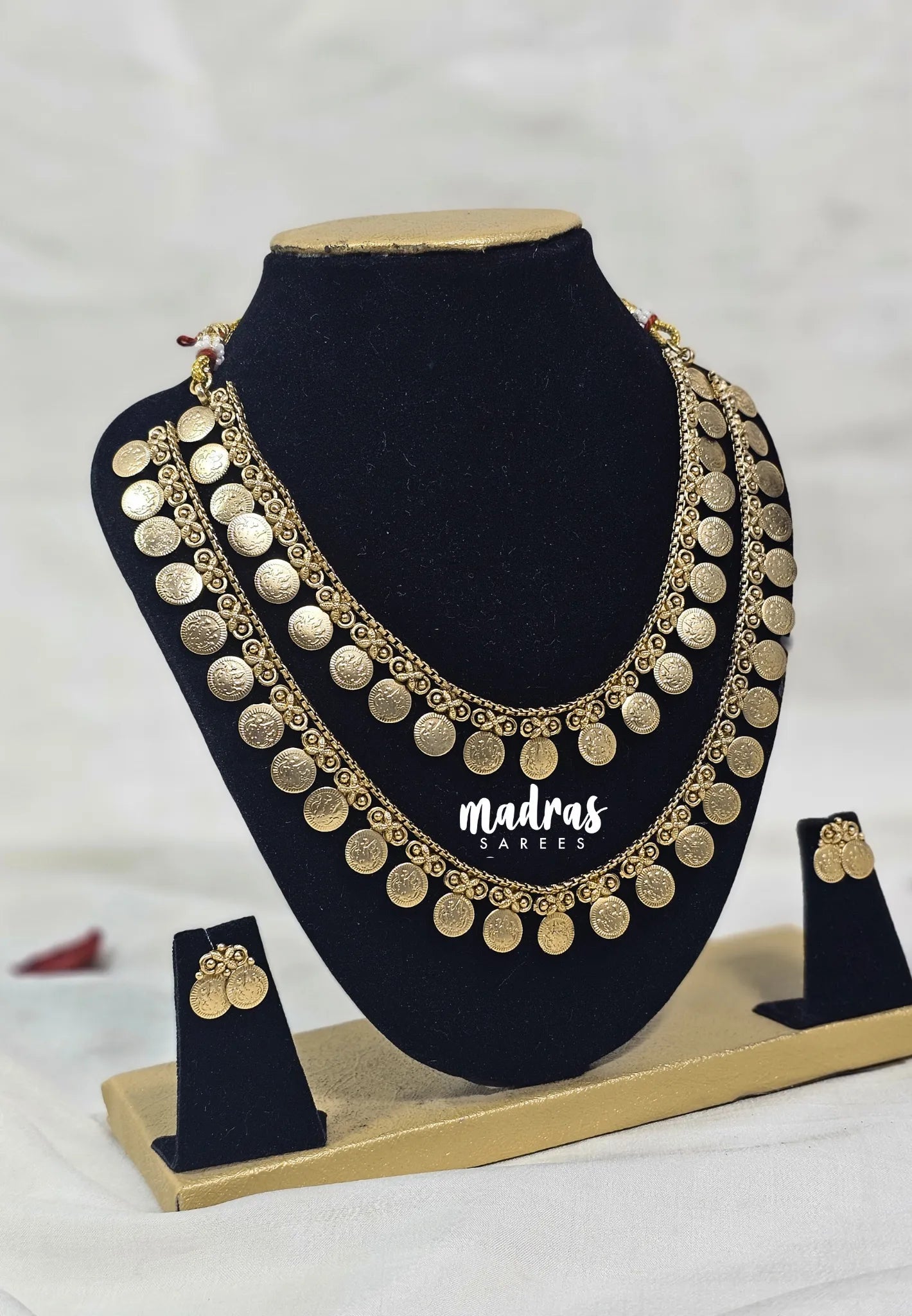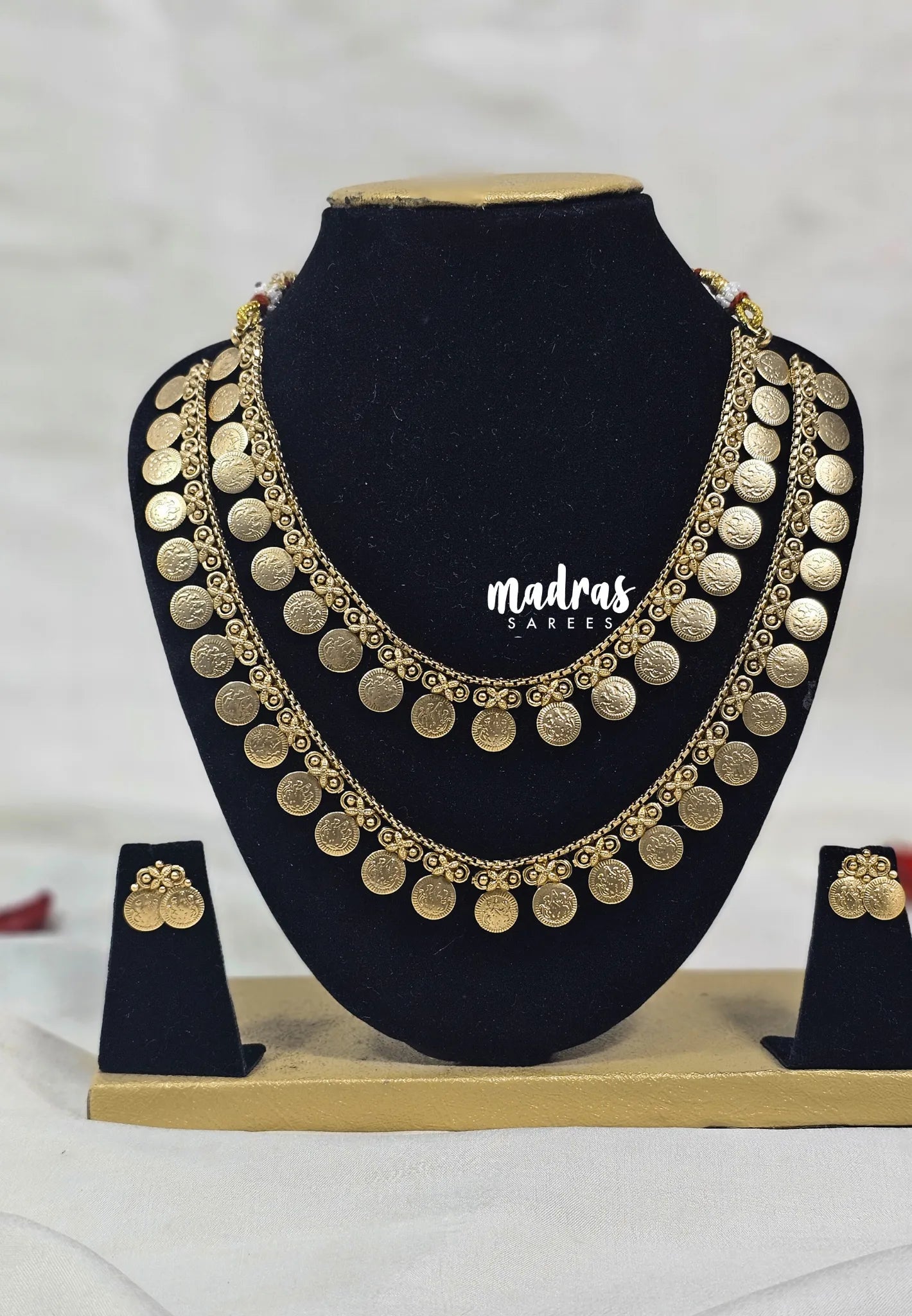 Elevate your style with the Gold Two Layer Lakshmi Coin Mala. Crafted with intricate detailing, this elegant design features beautifully layered Lakshmi coins, symbolizing prosperity and divine grace. The rich gold-look finish delivers a classic appeal without the heaviness of real gold, making it ideal for festive celebrations as well as modern ensembles. A graceful accessory that adds cultural charm and understated luxury to any look.