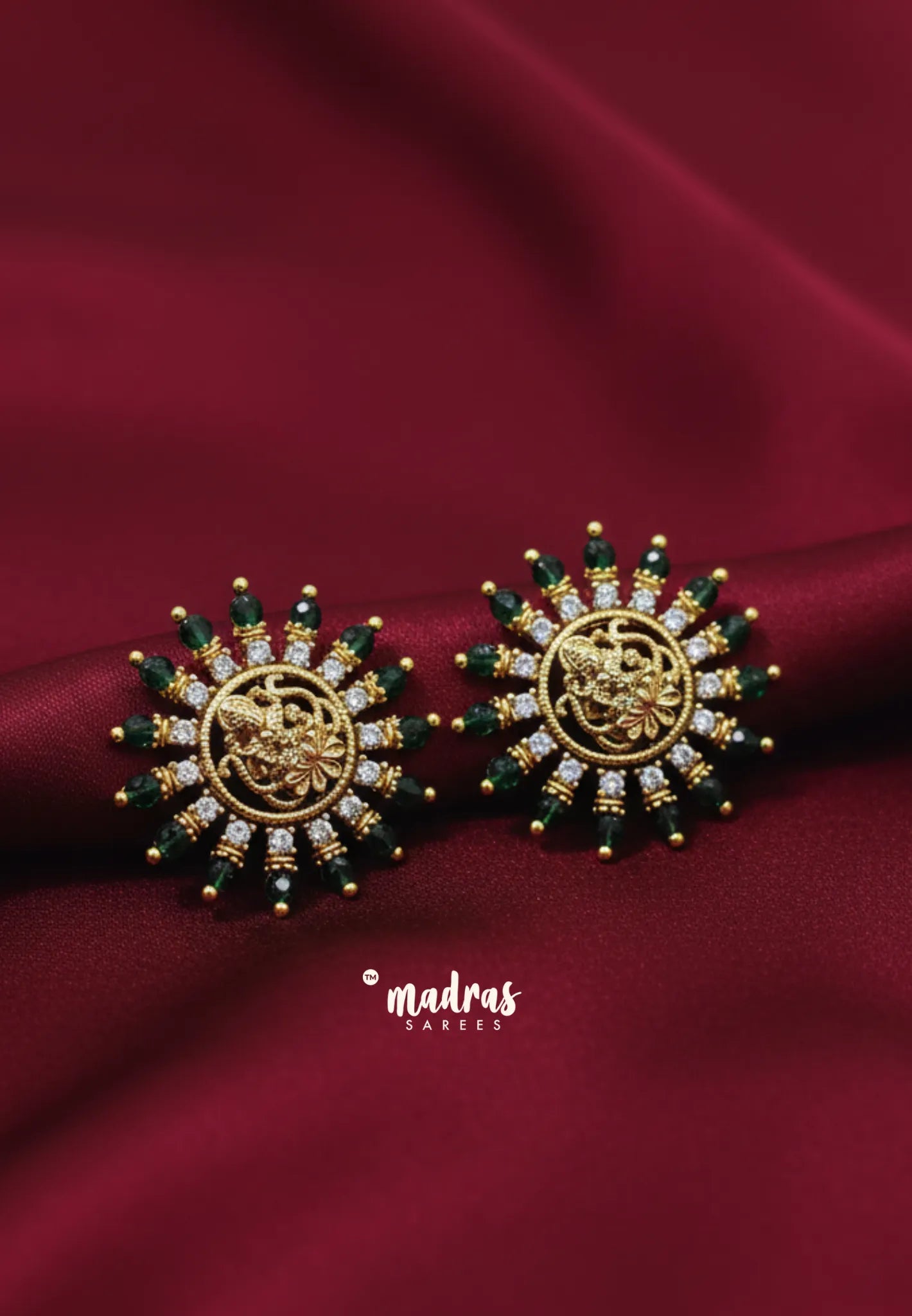 Adorned with intricate carvings of Goddess Lakshmi, these antique gold-toned earrings exude divine charm. Accented with ruby and emerald stones, they’re perfect for traditional and festive occasions.