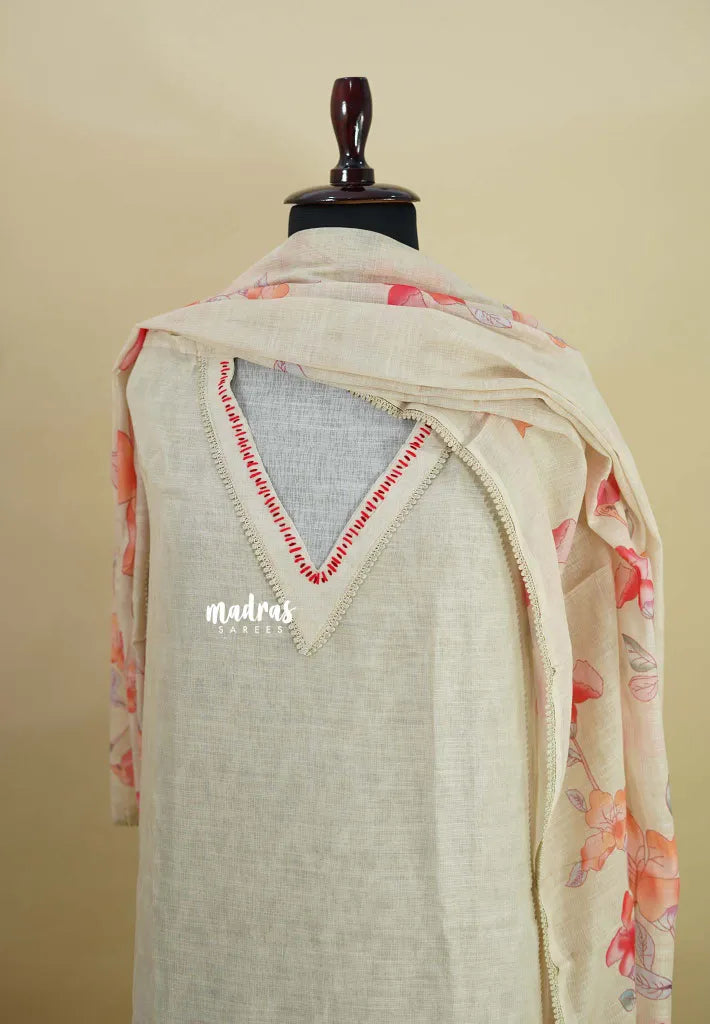 Crafted from premium linen, this salwar suit brings together floral digital prints and delicate hand-stitched embroidery for a truly elegant finish. Paired with a matching dupatta and bottom, it’s perfect for festive gatherings and graceful everyday wear.
