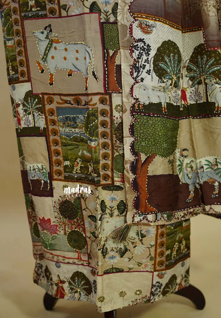 Top: Premium Muslin Silk with full Indian art digital print and hand-stitched highlights (2.5 m approx.)