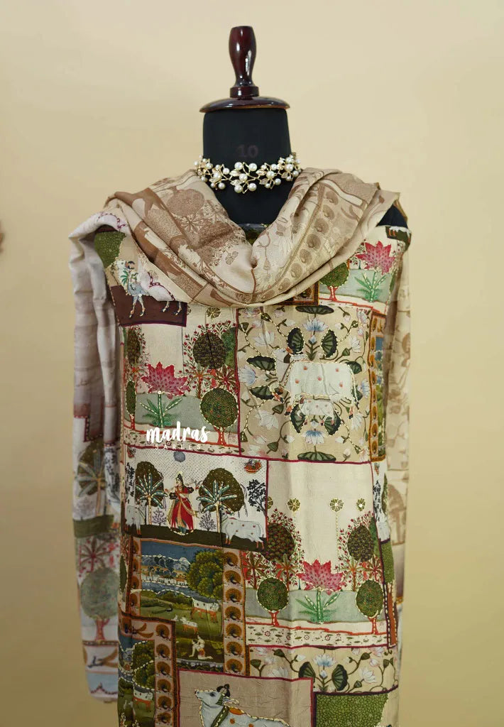 An exquisite muslin silk salwar suit set that beautifully showcases hand-stitched detailing inspired by traditional Indian art depictions.