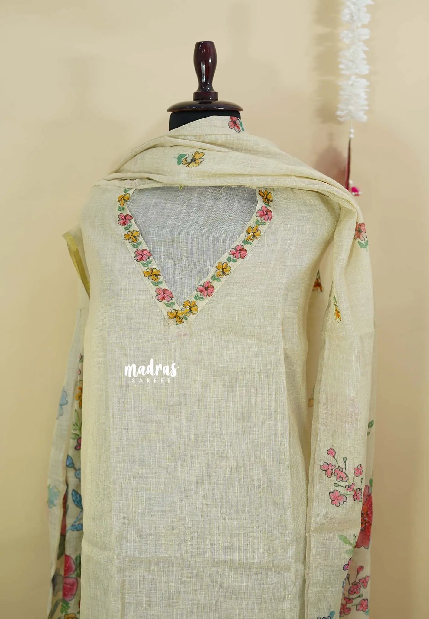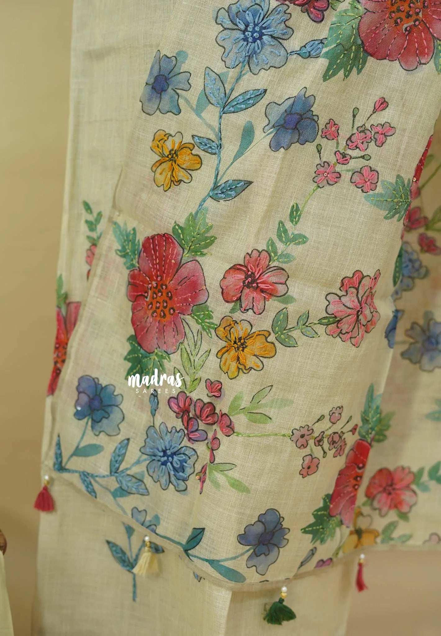 ✨ Dupatta: Linen with Floral Prints & Hand-Stitched Embroidery Highlights (2.4 m approx.)