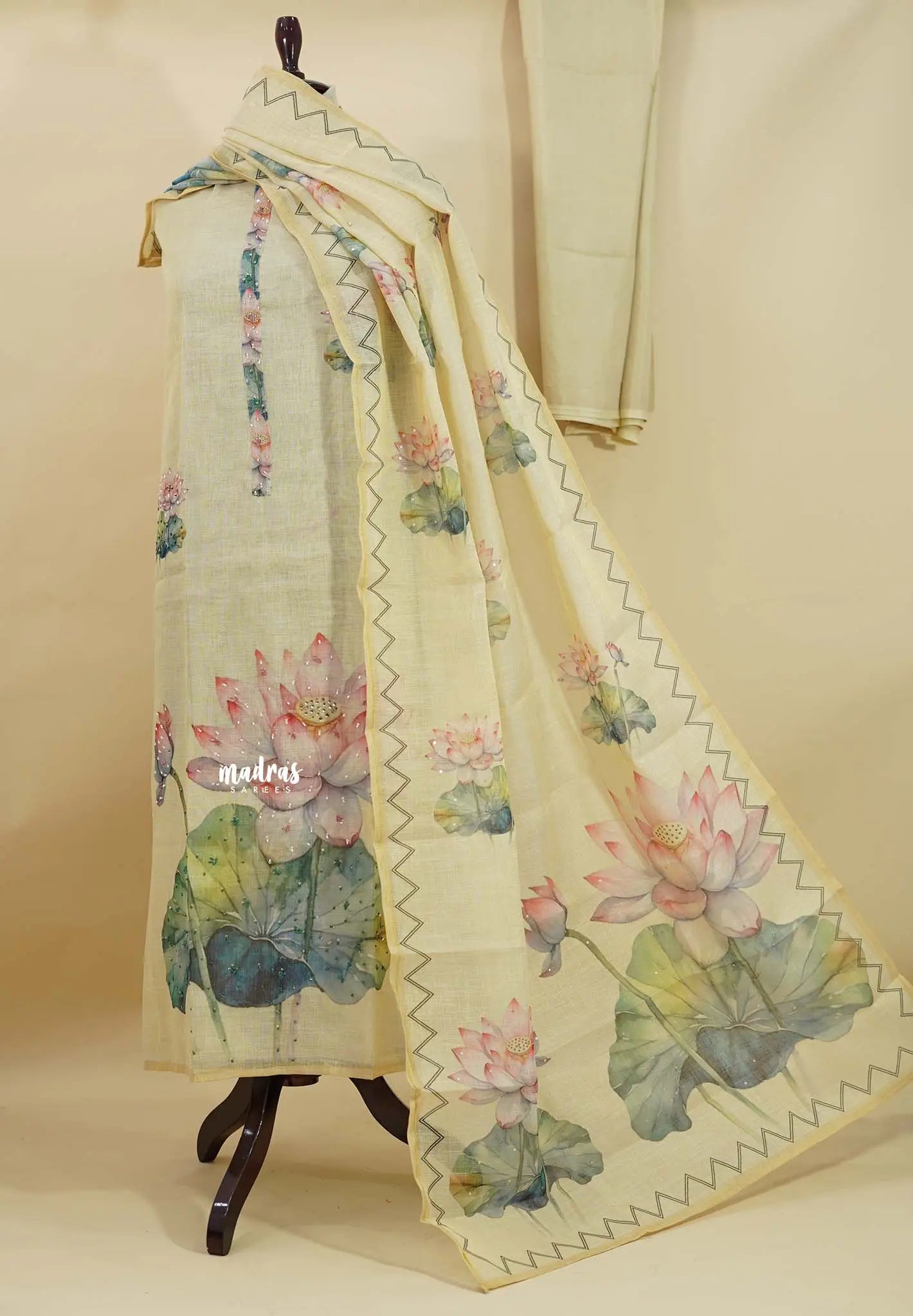 Amitha – Ivory Gold Tissue Linen Salwar Suit with Lotus Digital Prints & Hand Embroidery