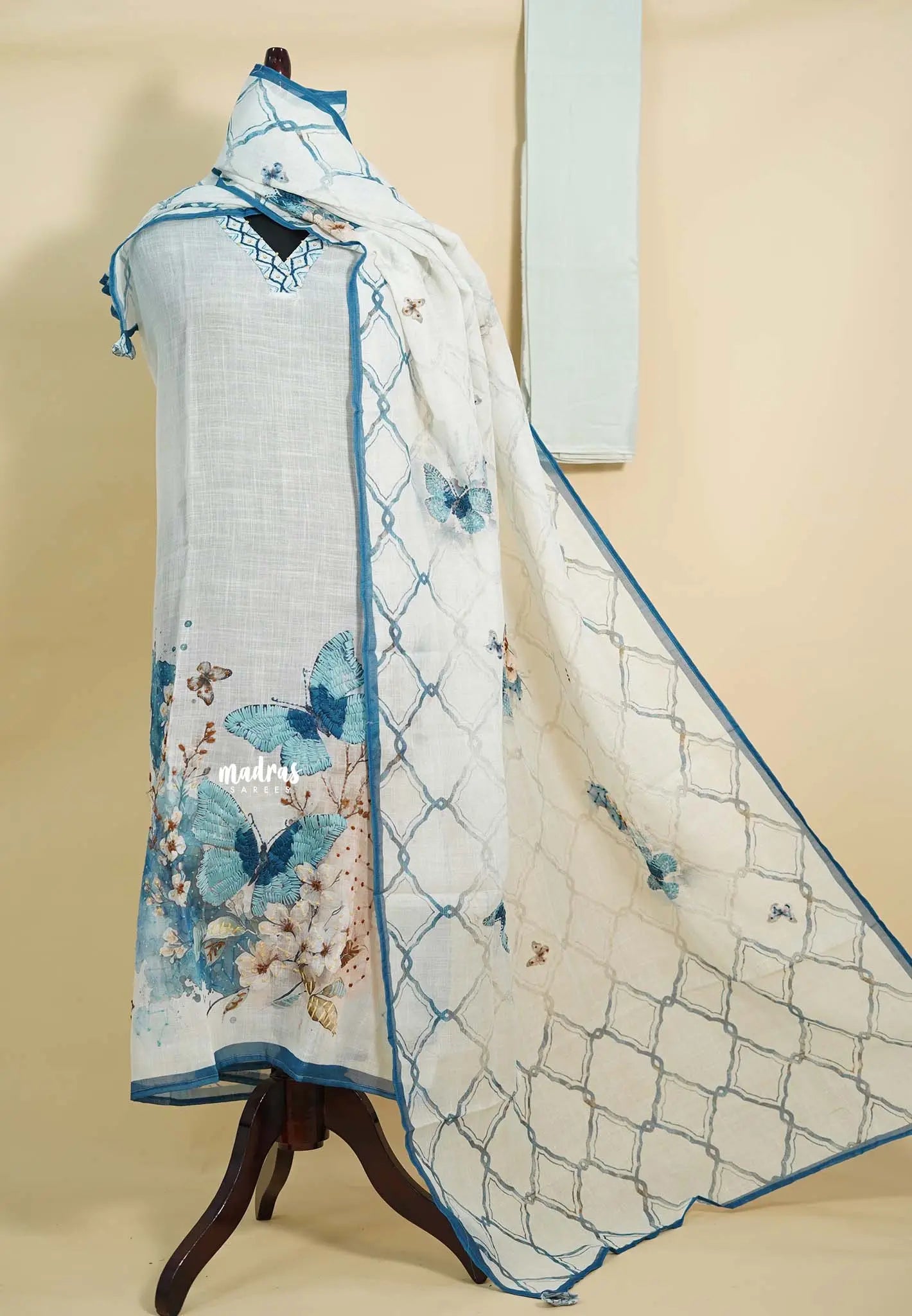 Crafted from pure linen, this unstitched salwar suit is a celebration of elegance and artistry. The fabric is adorned with butterfly and floral digital prints, accentuated by delicate hand-stitched embroidery for a refined finish. The set includes a matching bottom and a linen dupatta with all-over butterfly accents and embroidered lattice design, making it a perfect choice for festive and occasion wear.