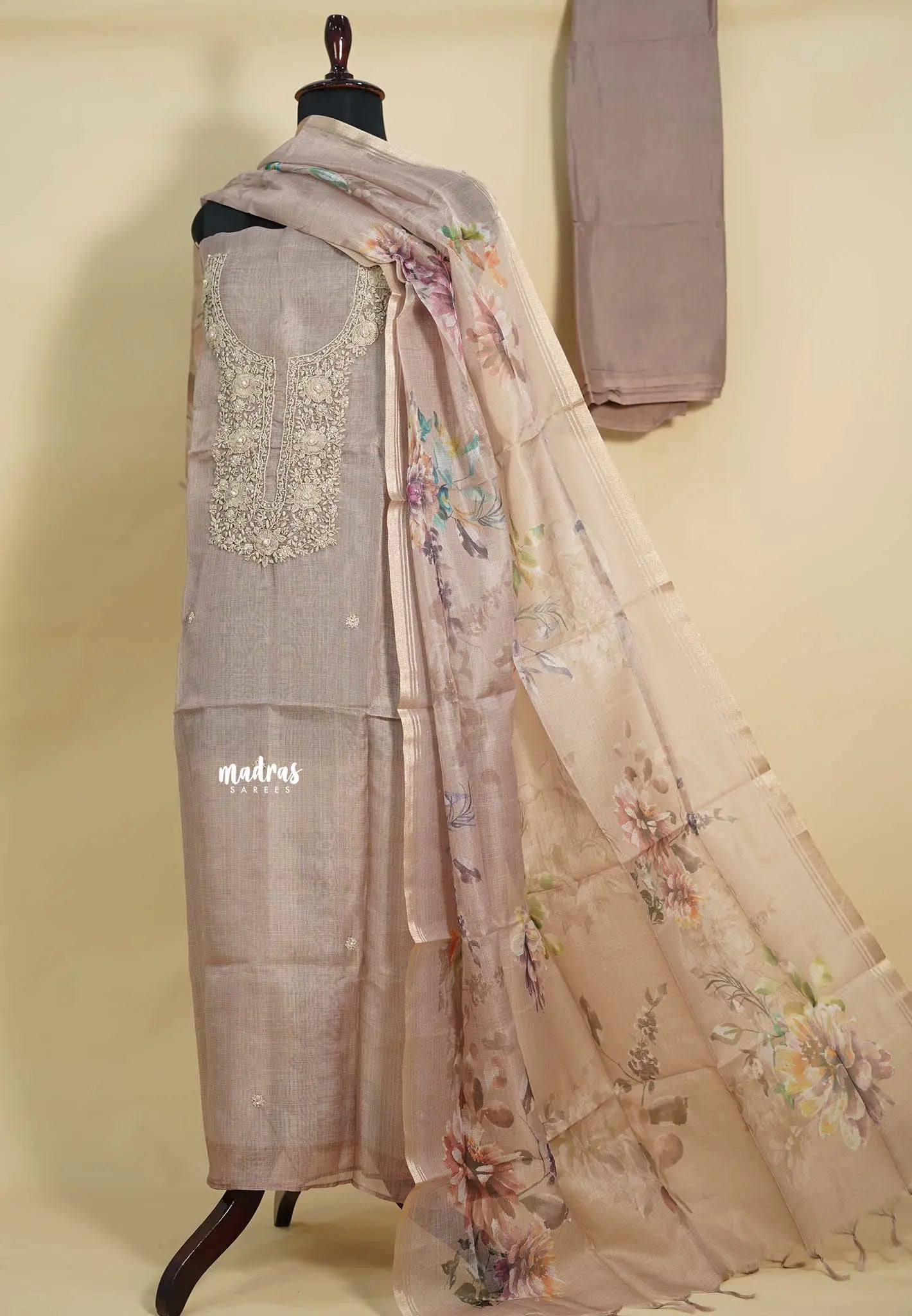 Elegance meets sophistication in this pure Kota silk salwar suit, beautifully hand-embroidered with delicate floral motifs on the yoke. The intricate embroidery is highlighted with pearls and resham thread, lending a graceful charm. Paired with a digitally printed floral dupatta in soft pastel tones, this set blends timeless handcraft with modern finesse. The lightweight Kota silk fabric ensures a comfortable and regal drape, perfect for festive gatherings, weddings, and evening occasions.