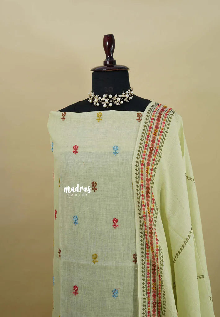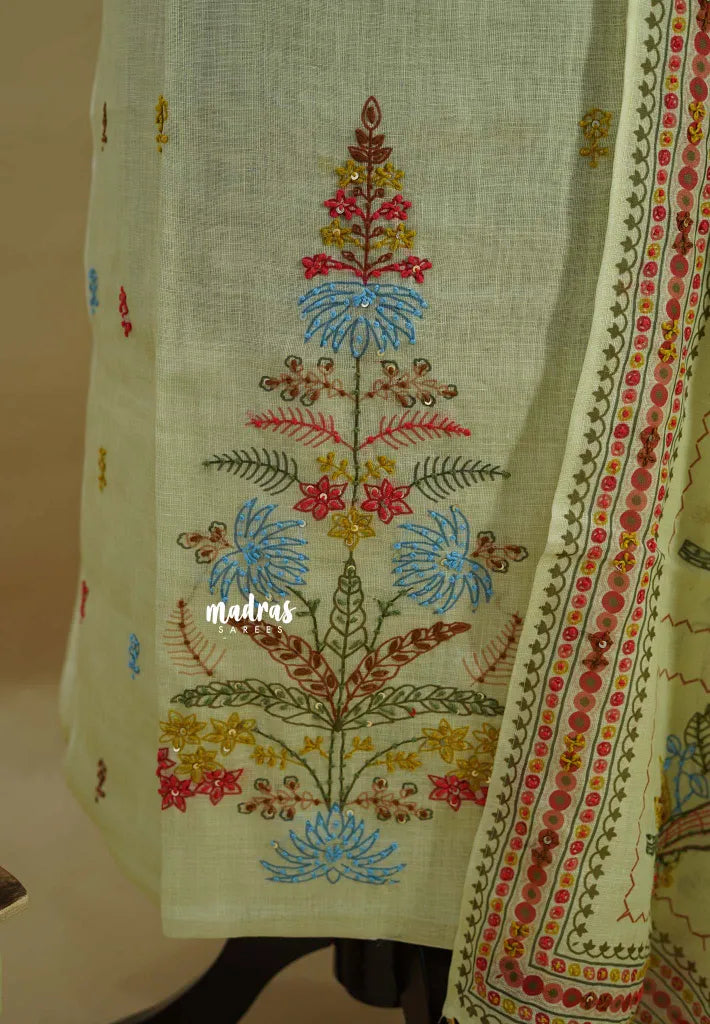 Amitha – Pastel Lemon Premium linen Salwar Suit with tree Prints + Hand-Stitched Embroidery