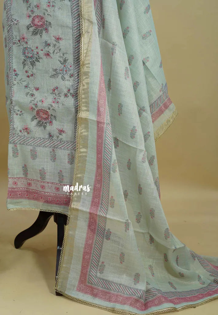 Crafted from premium linen, this salwar suit brings together floral digital prints and delicate hand-stitched embroidery for a truly elegant finish. Paired with a matching dupatta and bottom, it’s perfect for festive gatherings and graceful everyday wear.