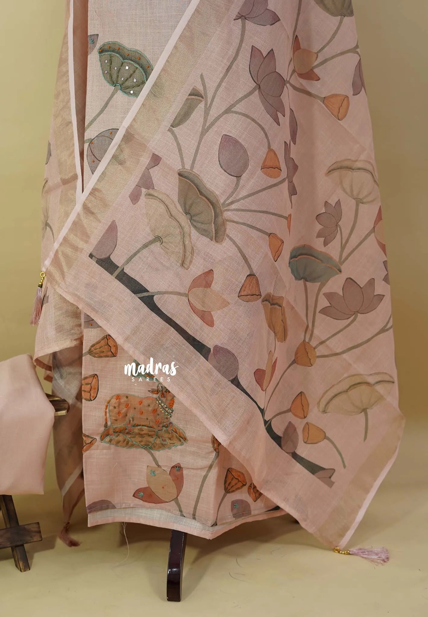 Crafted from premium linen, this salwar suit brings together pichwai nandhi digital prints and delicate hand-stitched embroidery for a truly elegant finish. Paired with a matching dupatta and bottom, it’s perfect for festive gatherings and graceful everyday wear.