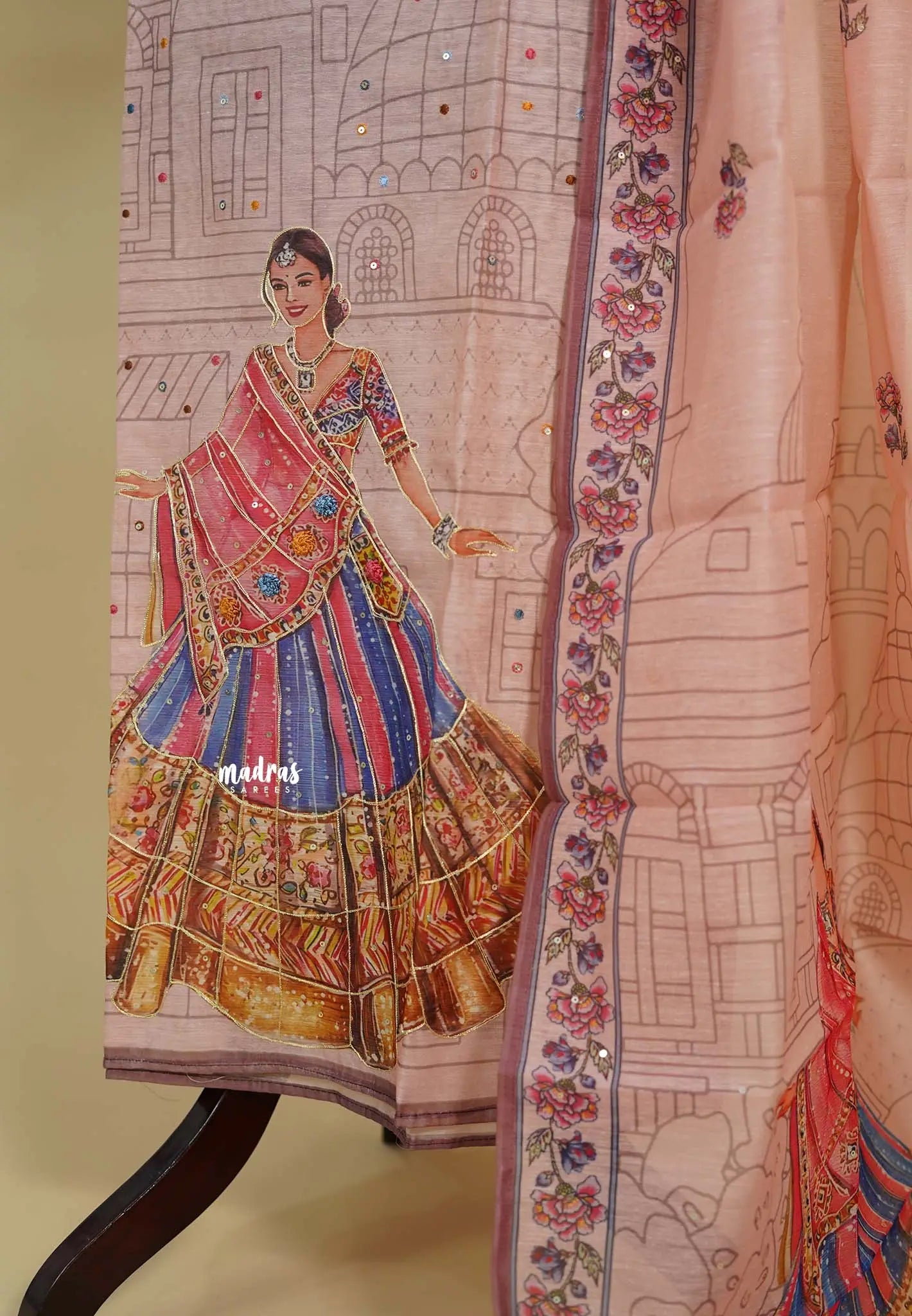 A masterpiece in fabric, this pastel pink premium Chanderi silk unstitched salwar suit is adorned with a captivating digital painting of a graceful girl, brought to life with delicate zari and sequins highlights on the yoke and front. The lightweight sheer texture of Chanderi silk adds charm and elegance, while the matching santoon bottom ensures comfort. The look is completed with a digitally printed Chanderi silk dupatta, beautifully framed with floral borders – perfect for festive and special occasions.