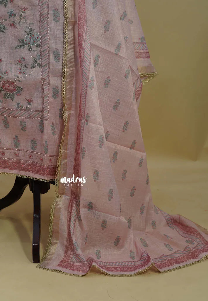 Amitha – Pastel Pink Premium linen Salwar Suit with Floral Digital Prints + Hand-Stitched Embroidery