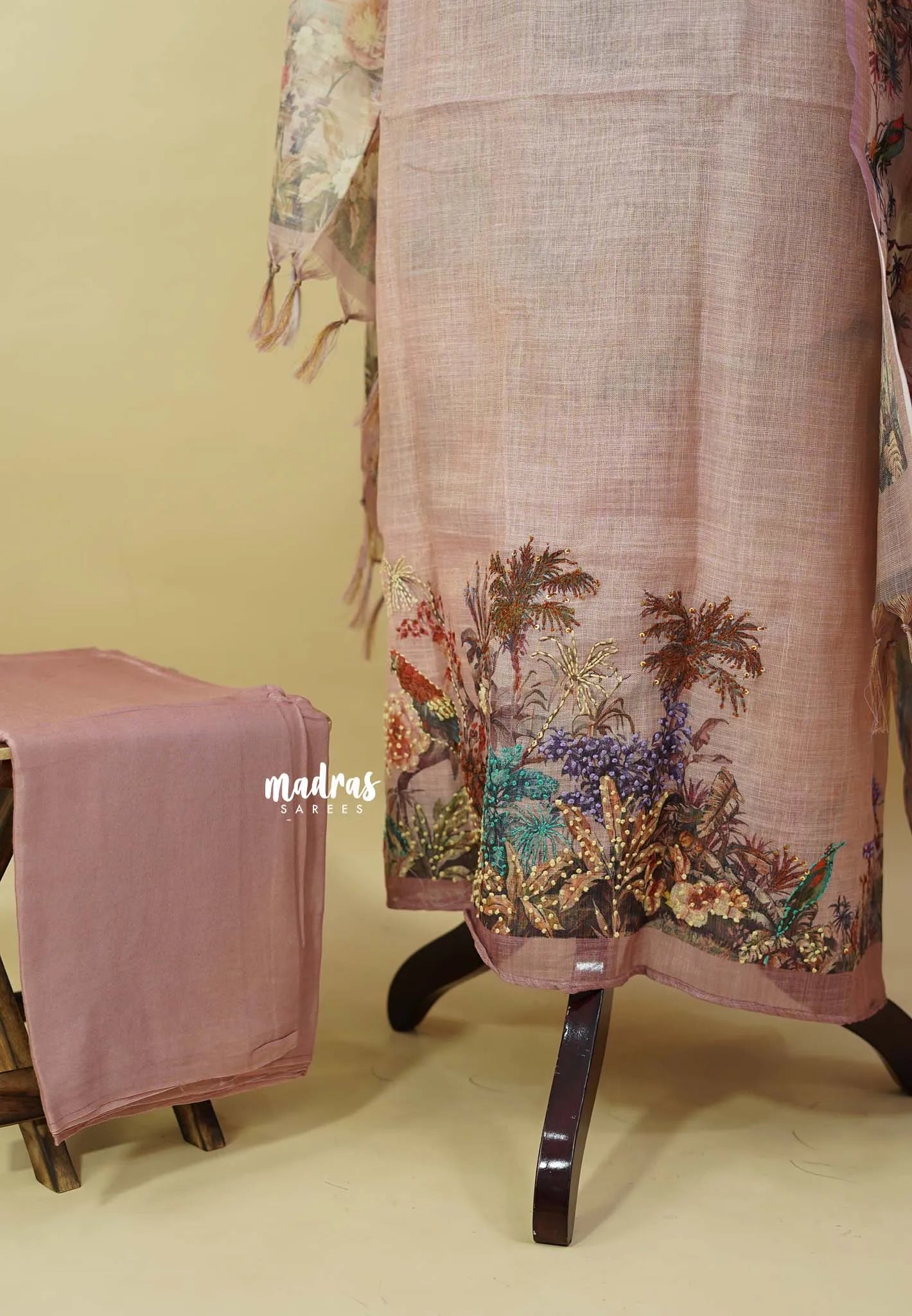 Crafted from premium linen, this salwar suit brings together digital prints inspired by nature and delicate hand-stitched embroidery for a truly elegant finish. Paired with a matching dupatta and bottom, it’s perfect for festive gatherings and graceful everyday wear.
