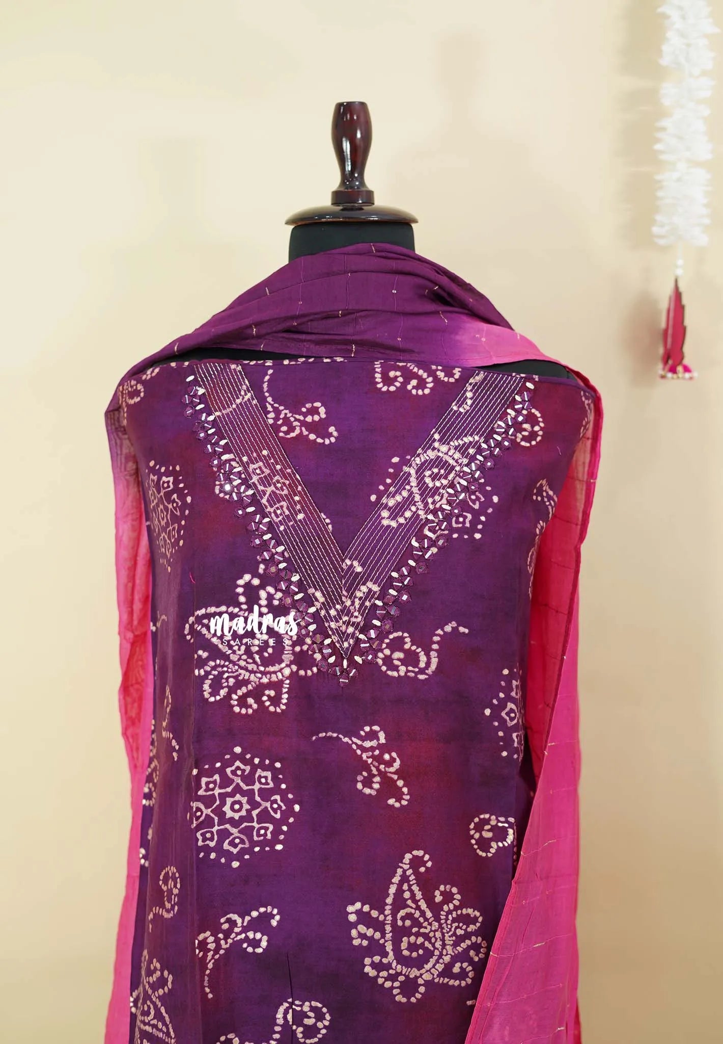 A graceful semi silk salwar suit featuring traditional Bandhani patterns with a beautiful dual-shade effect. The elegant V-neck detailing adds charm, paired with a soft mul cotton dupatta and plain matching bottom for a complete festive-ready look.