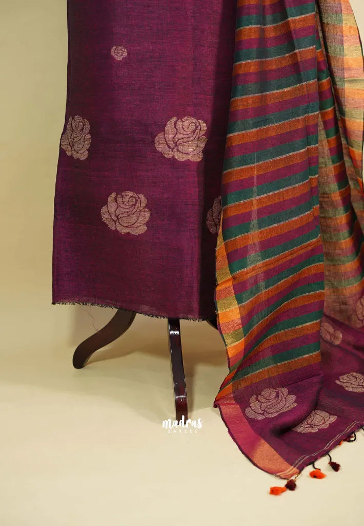 Celebrate timeless craftsmanship with this pure organic linen salwar set in a striking blue shade. The kurta is adorned with delicately hand-woven floral motifs, blending elegance with tradition. The highlight of the set is the striped linen dupatta, accented with woven floral touches, adding a vibrant contrast. Paired with a plain bottom of your choice, this set is perfect for casual elegance, festive gatherings, and day-to-day sophistication.