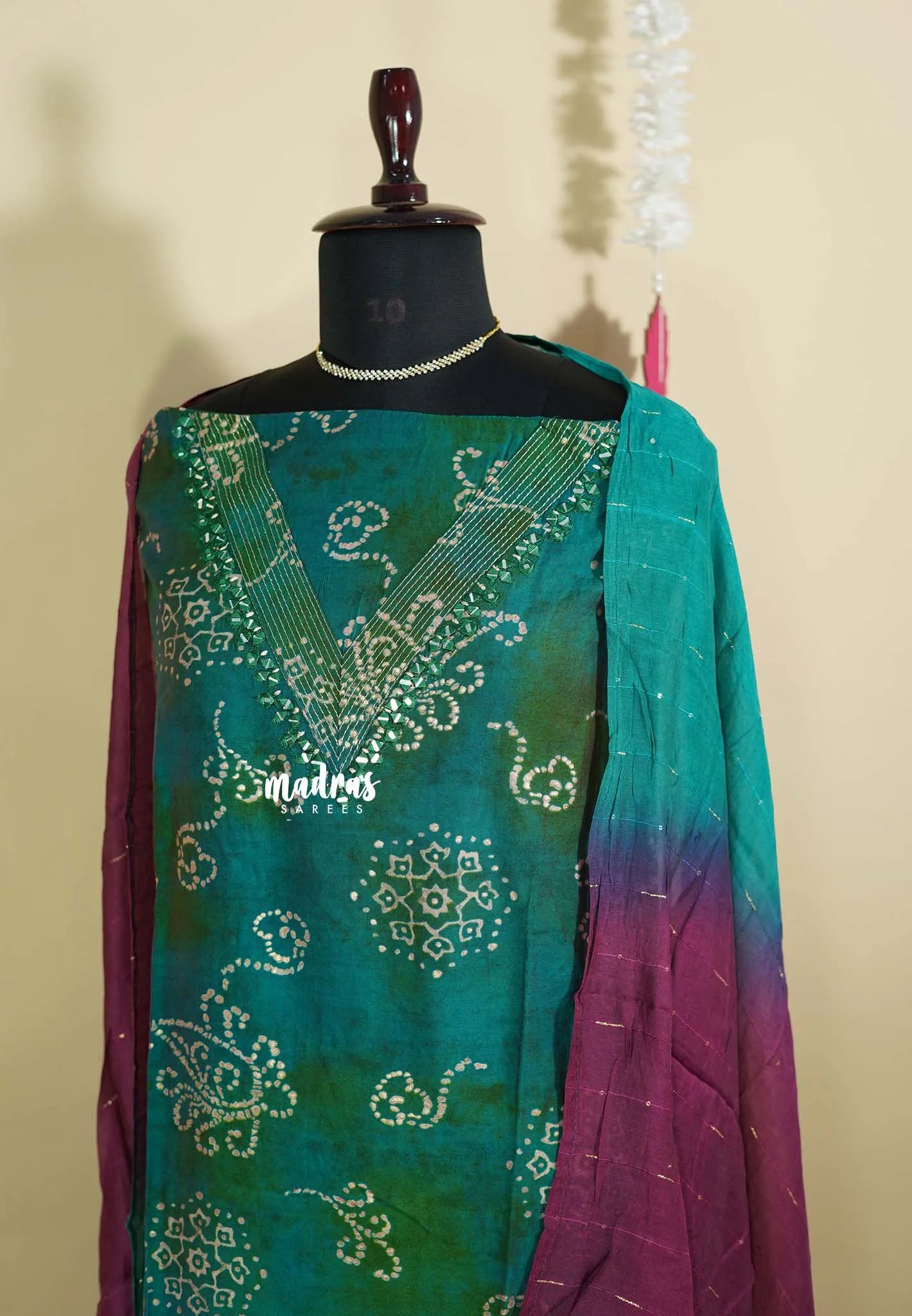Amitha – Teal Green Elegand bandhani dualshade semi silk salwar suit with v neck and mul cotton dupatta and bottom