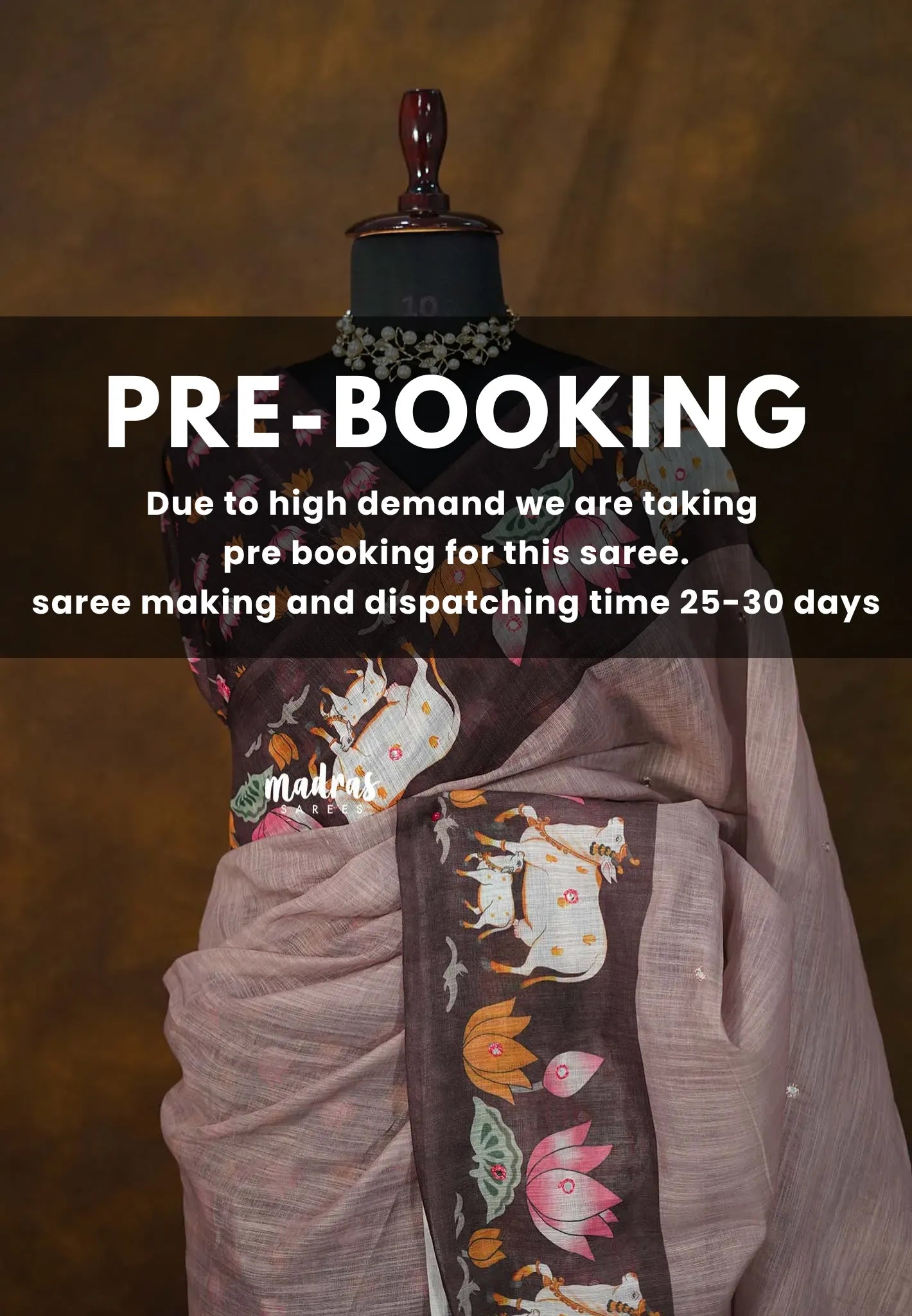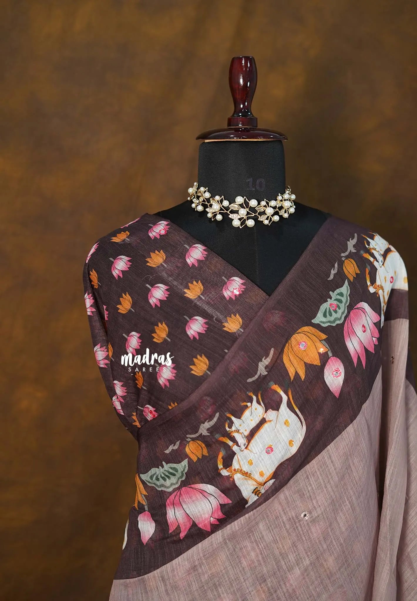 Step into a world of elegance and devotion with this exquisite Linen Cotton Saree, beautifully adorned with a Pichwai-inspired cow and lotus border. The soft antique-mauve body gives the saree a muted, earthy sophistication, while the rich dark border highlights the intricate artwork.