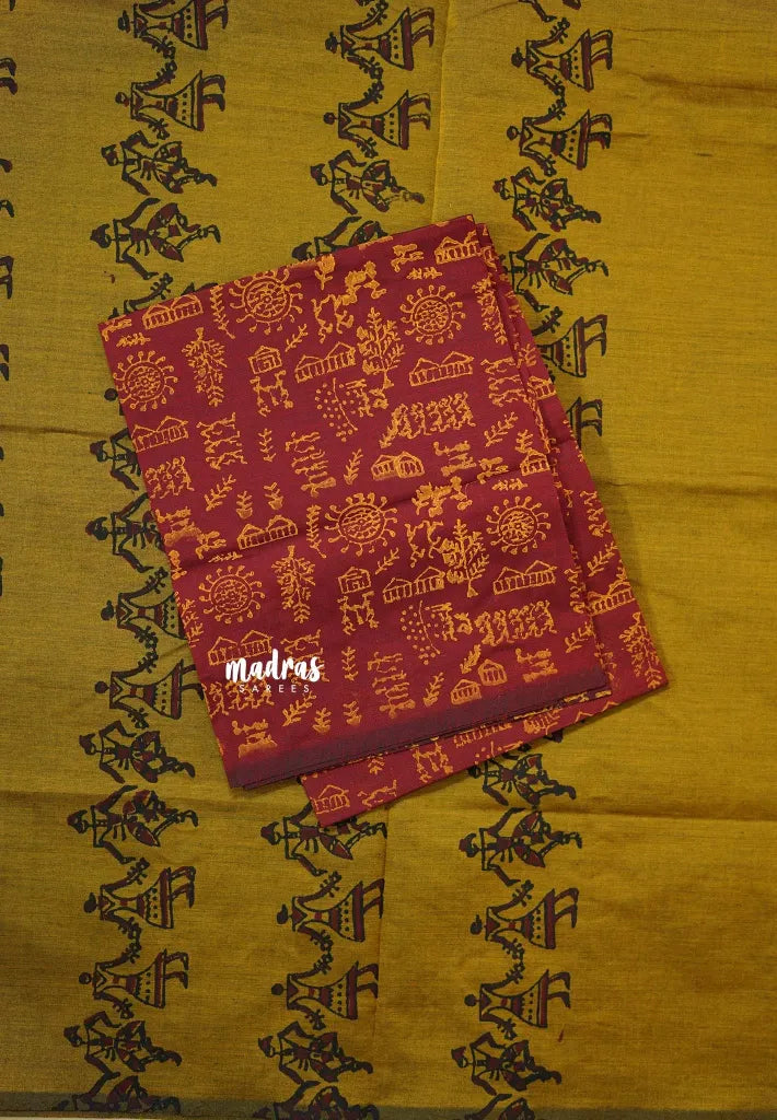 Antique Mustard - Ambigai polycotton with contrast blouse combo