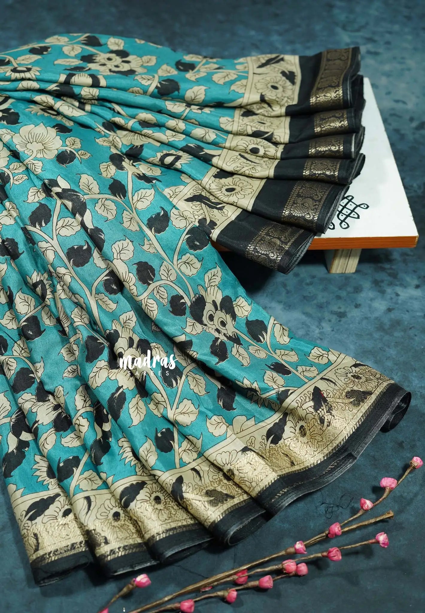 Aqua blue - Kalanjali chanderi Printed silk with kalamkari floral prints