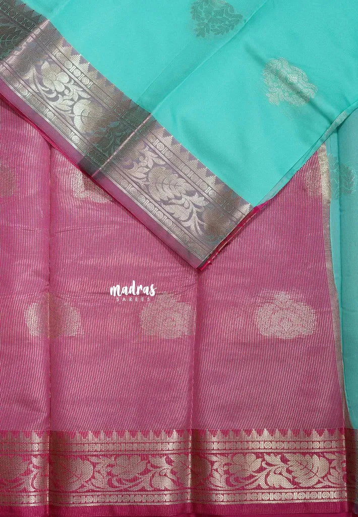 Kanchi semi Silk Saree with grand intregate buttas weaving all over the body. Semi silk sarees represent modern variations of classic silk sarees influenced by the need for luxury and comfort in silk sarees at very affordable prices.