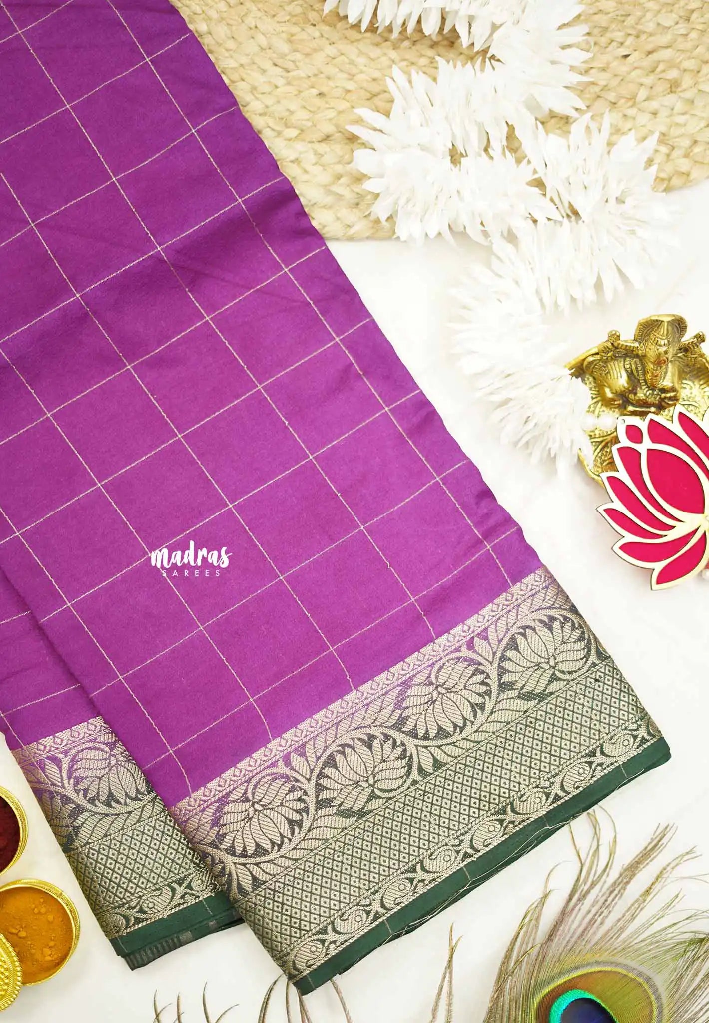A Crushed Semi Mysore Silk Saree with Checks features smooth, semi-silk fabric with a subtle sheen and a crinkled, textured crushed effect. The saree showcases a classic checkered pattern, which can range from small to larger squares, adding a modern touch. The border includes simple zari or threadwork, and the pallu complements the design with contrast or matching patterns.