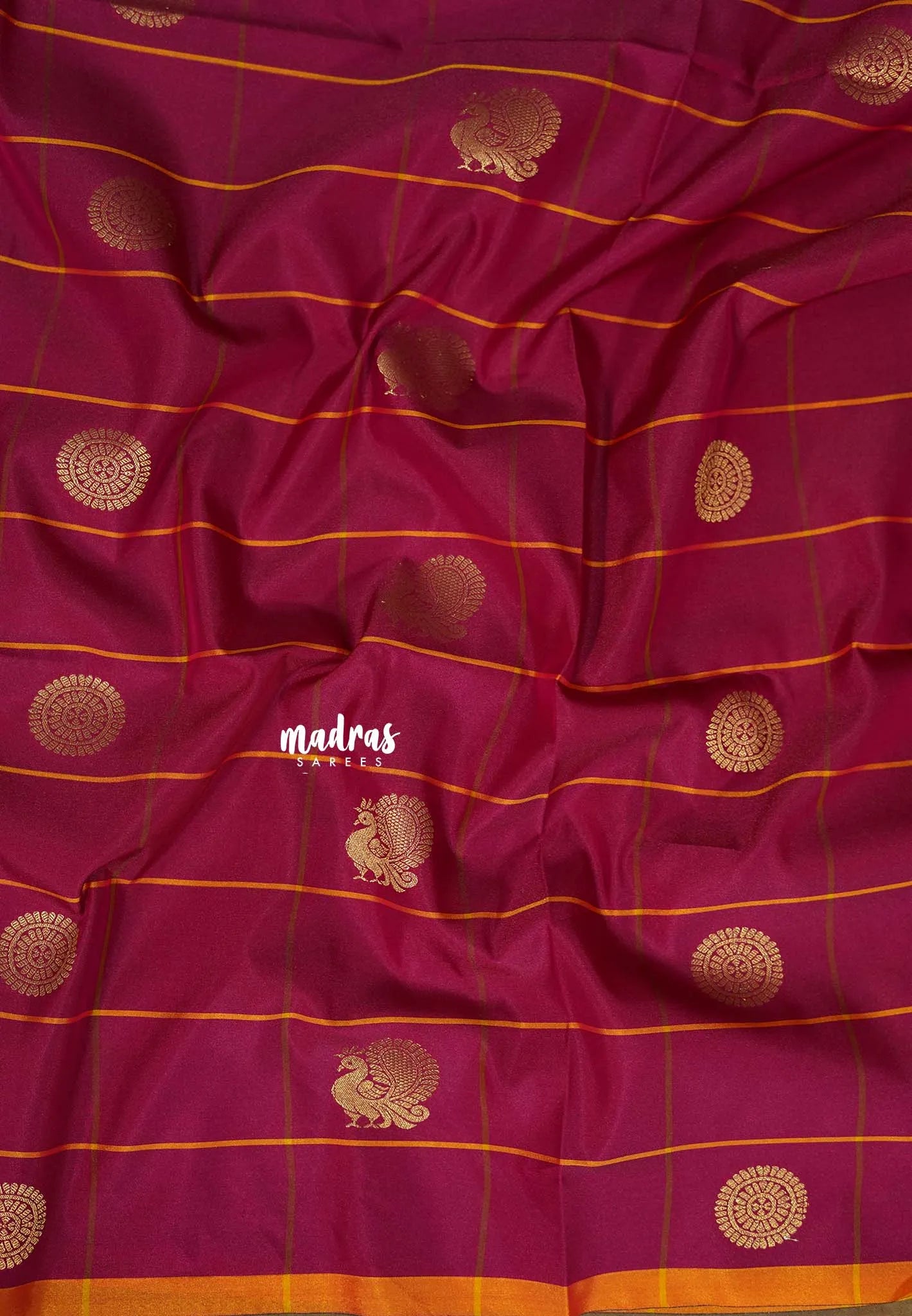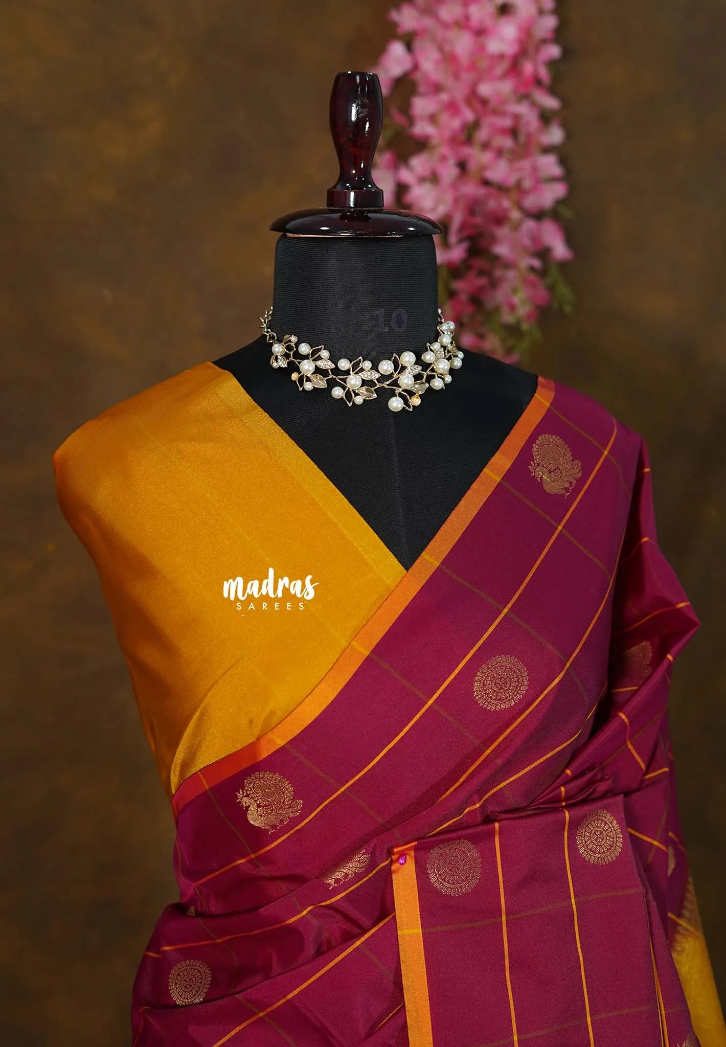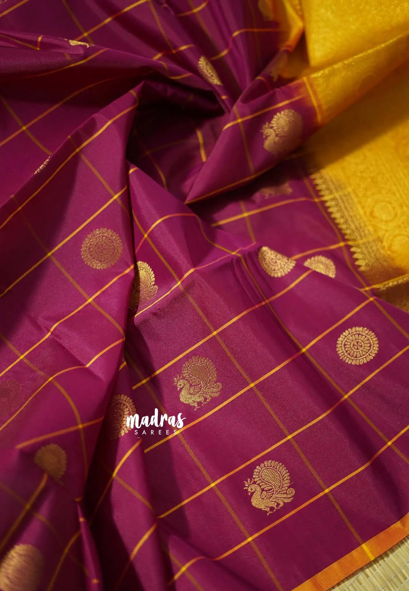 A graceful drape, Hamsavalli features delicate zari checks adorned with traditional peacock and rudraksham motifs. Woven in soft silk, this saree is a perfect blend of heritage charm and contemporary finesse — ideal for festive occasions and timeless celebrations.