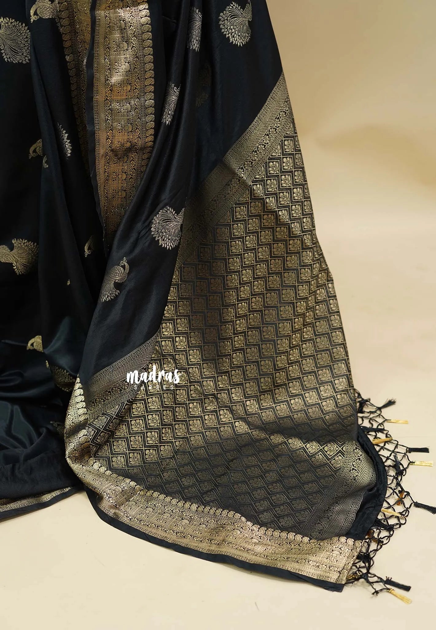 Step into regal elegance with this Srivalli Pure Satin Silk Saree. The saree features intricately woven golden peacock buttas that add a touch of heritage charm, while the luxurious gold zari border and pallu exude grandeur. With its lustrous satin silk texture and timeless motifs, this saree is a perfect choice for weddings, festive occasions, and cultural celebrations.