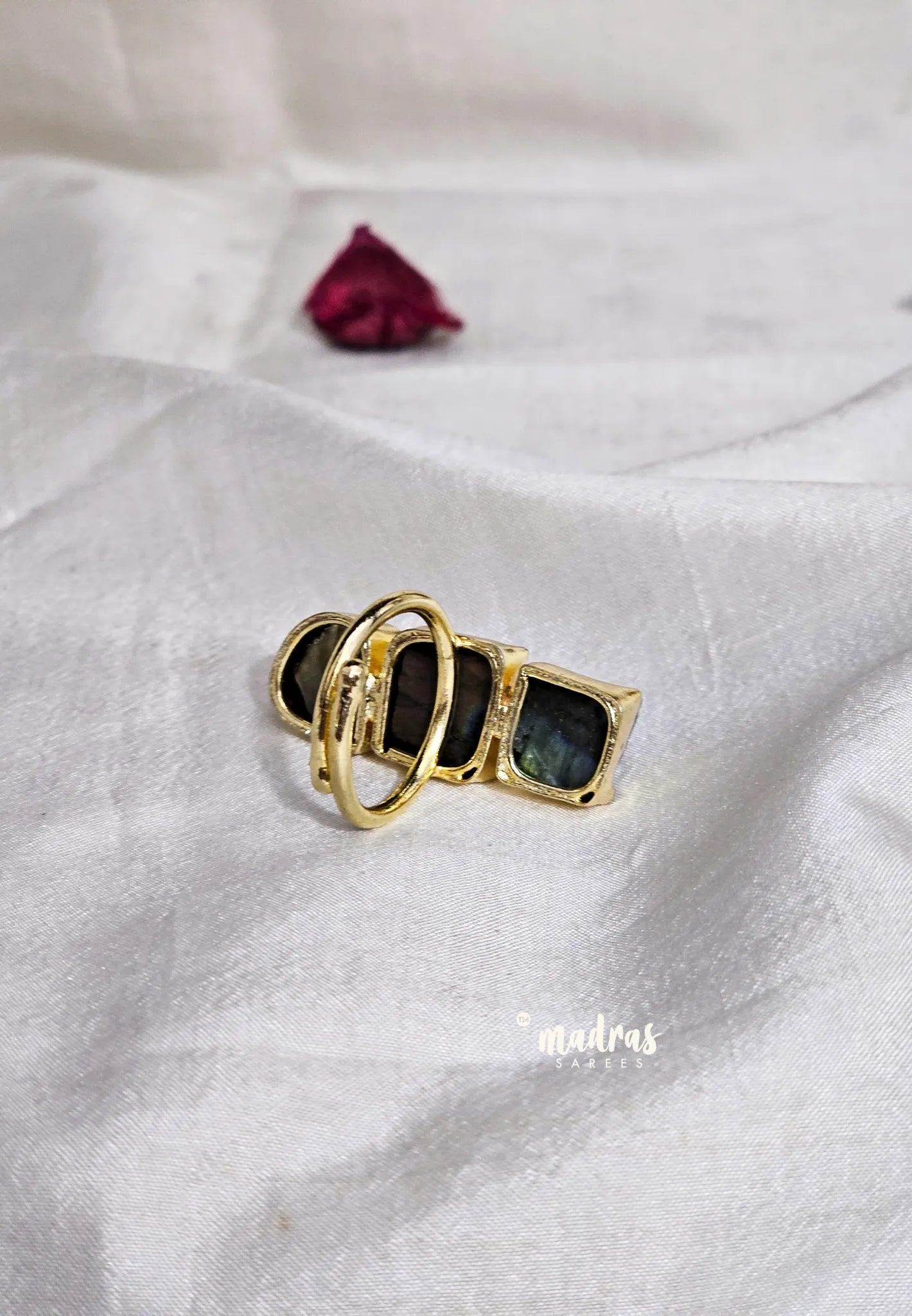 Imported handcrafted statement ring featuring natural raw stones set in a sleek designer frame. Designed for effortless styling, this adjustable ring adds a refined, contemporary touch to both ethnic and western outfits. Perfect for everyday elegance or special occasions.