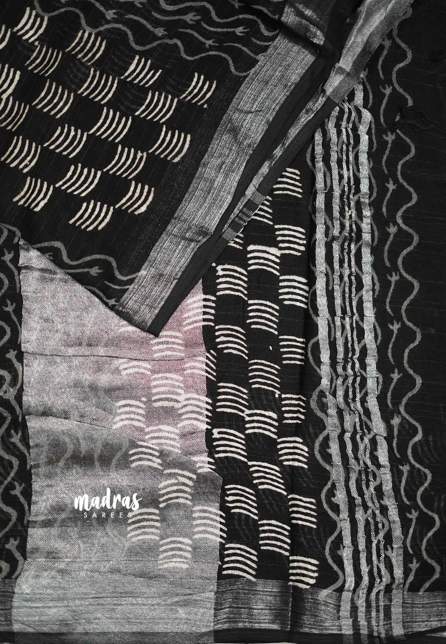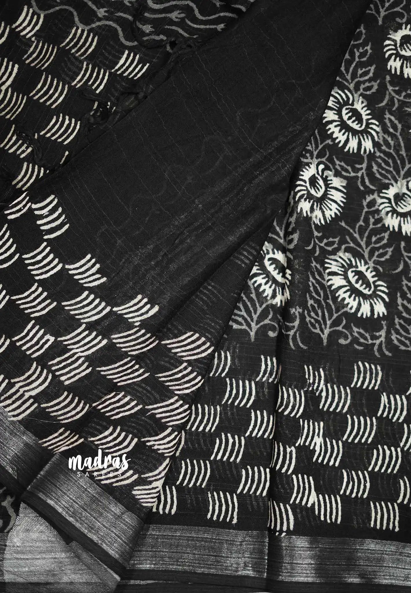 A soft linen cotton saree with handblock prints, featuring a beautiful silver jari border. The saree has intricate handblock motifs, while the silver border adds an elegant touch. The pallu is also printed, showcasing bold patterns, and the blouse is plain, offering a simple contrast to the detailed saree. This combination is perfect for both casual and formal occasions.
