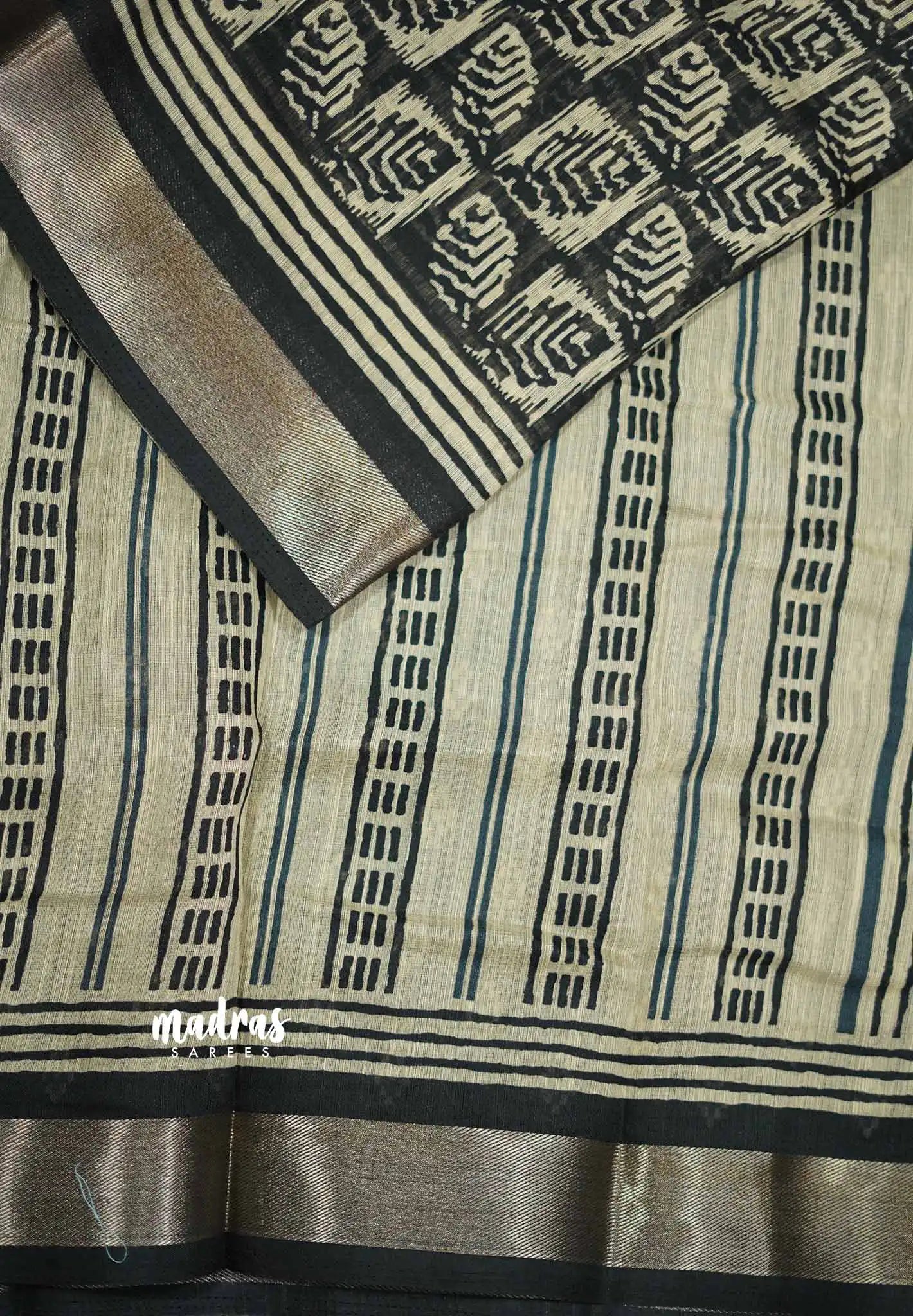 A blended linen cotton saree in a chic combination of chikku (a warm, earthy brown) and black. The saree features a harmonious mix of these two shades, offering a sophisticated and contemporary look. The fabric is soft and breathable, perfect for comfort and style. The design may include subtle patterns or prints in contrasting colors, with the chikku tone adding warmth and the black creating a bold, classic contrast. The saree can be paired with a matching plain black blouse for a sleek, modern look.
