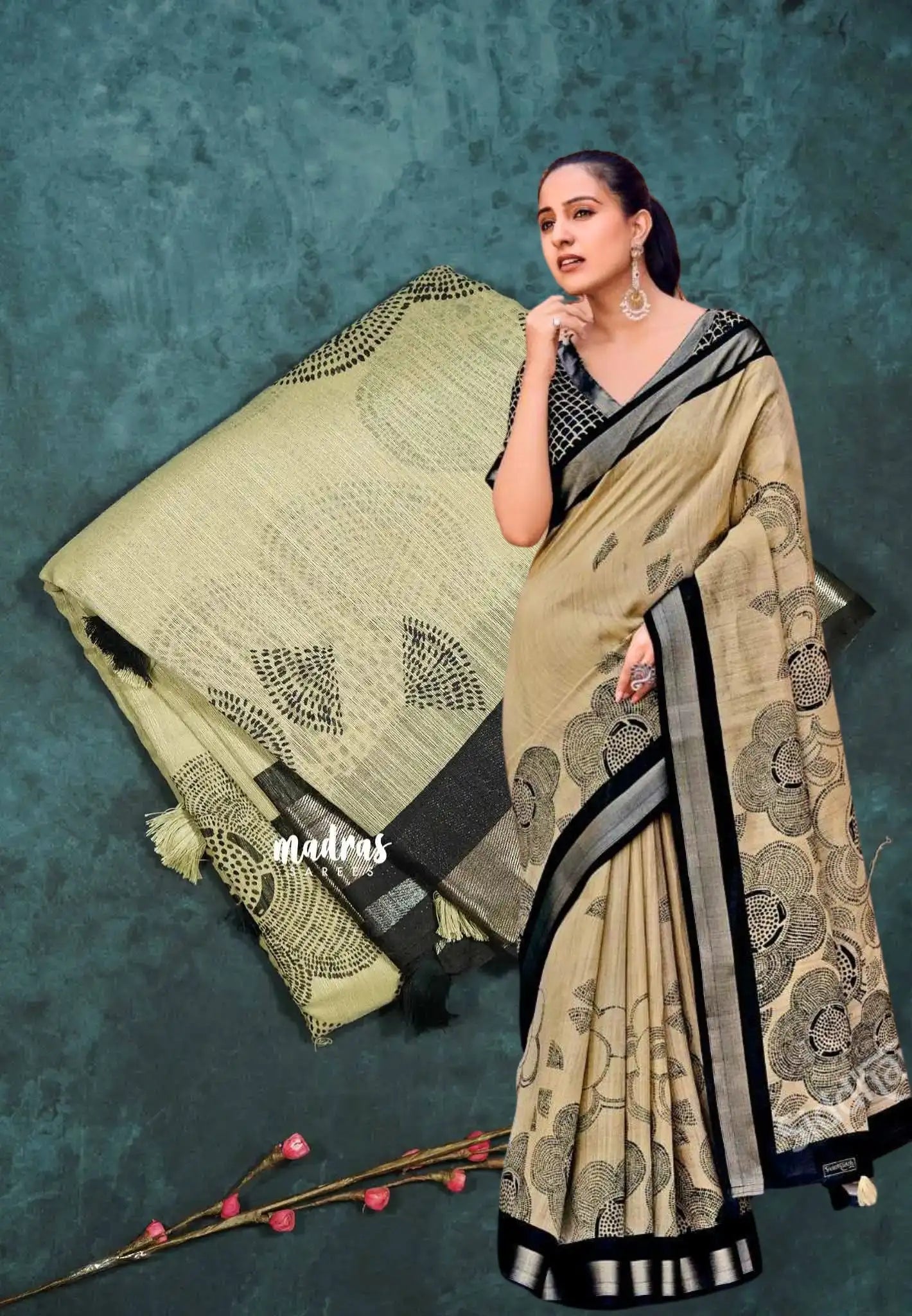 A blended linen cotton saree in a chic combination of chikku (a warm, earthy brown) and black. The saree features a harmonious mix of these two shades, offering a sophisticated and contemporary look. The fabric is soft and breathable, perfect for comfort and style. The design may include subtle patterns or prints in contrasting colors, with the chikku tone adding warmth and the black creating a bold, classic contrast. The saree can be paired with a matching plain black blouse for a sleek, modern look.