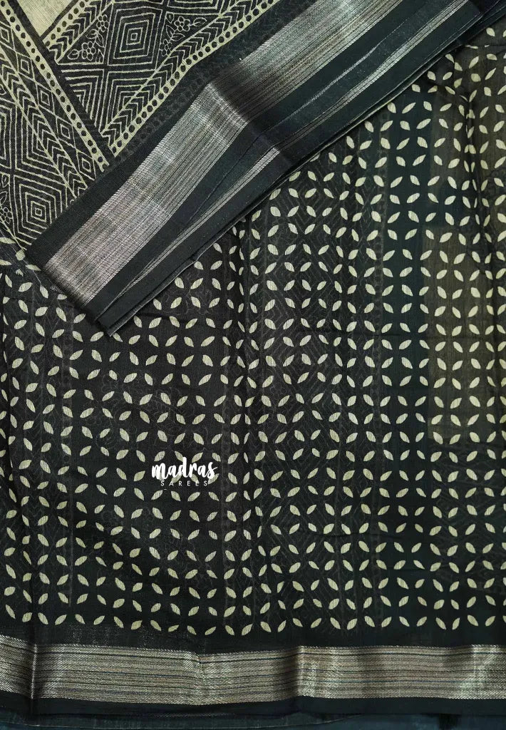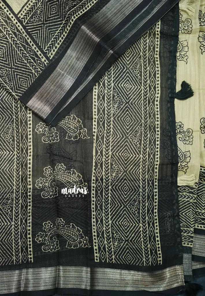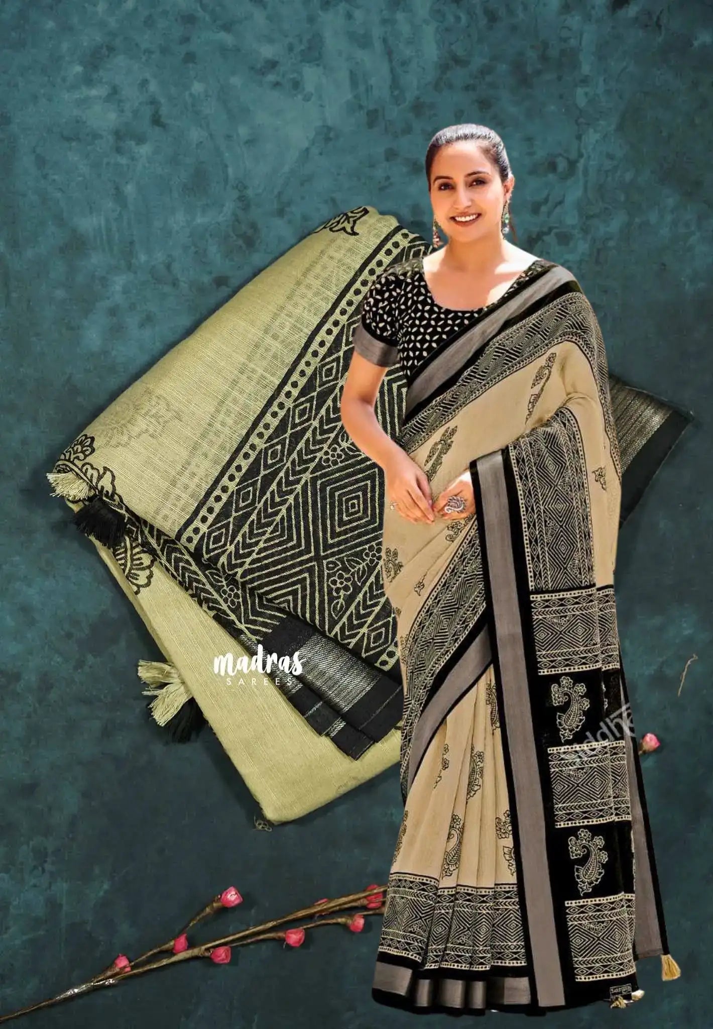 A blended linen cotton saree in a chic combination of chikku (a warm, earthy brown) and black. The saree features a harmonious mix of these two shades, offering a sophisticated and contemporary look. The fabric is soft and breathable, perfect for comfort and style. The design may include subtle patterns or prints in contrasting colors, with the chikku tone adding warmth and the black creating a bold, classic contrast. The saree can be paired with a matching plain black blouse for a sleek, modern look.