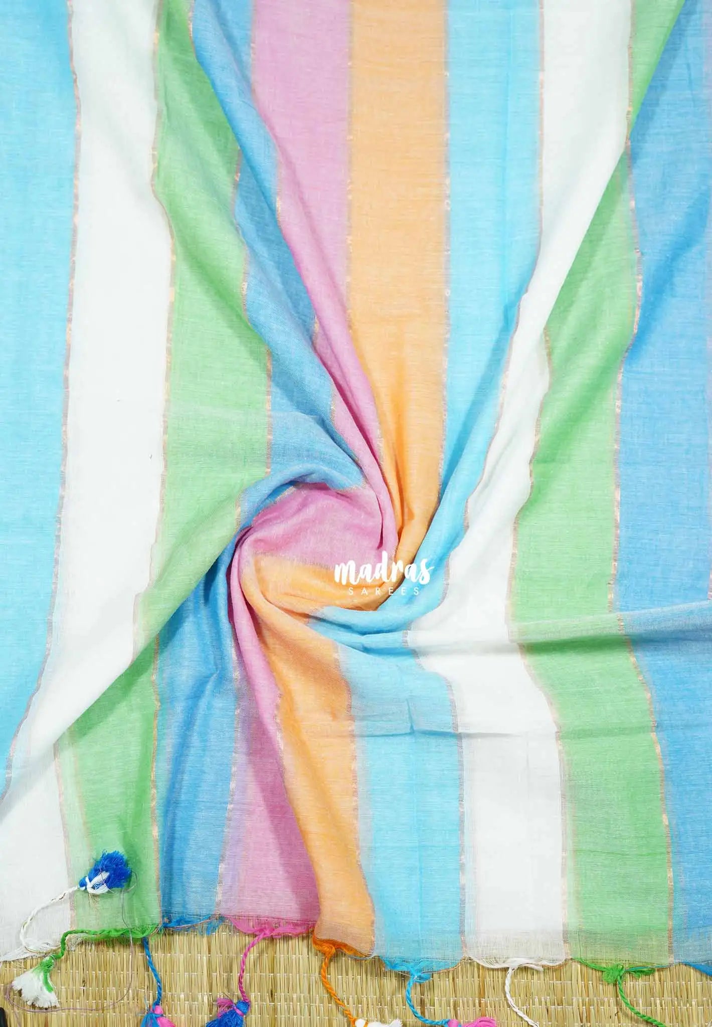 A Soft Mul Cotton Candy Pop Multicolor Saree is a vibrant and lightweight saree crafted from soft mul cotton, offering comfort and breathability. The saree features a playful mix of multicolors, creating a candy pop effect, perfect for casual or festive occasions. Its soft texture ensures a smooth drape, and it comes without a blouse, allowing you to pair it with a matching or contrasting blouse of your choice.