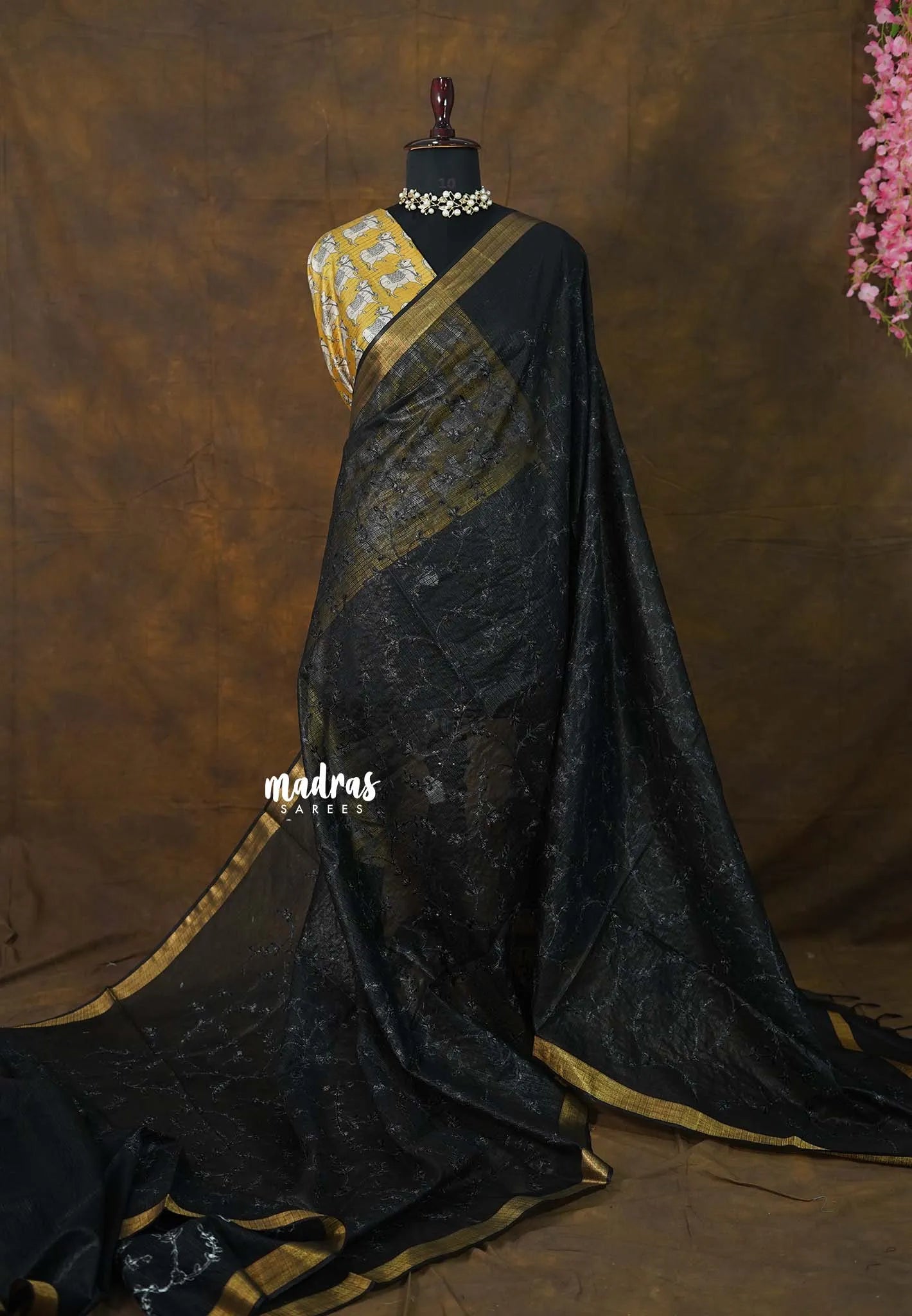 The saree includes a matching black running blouse that perfectly blends with the embroidery and border. It gives a seamless, elegant, and classic finish to the overall look.