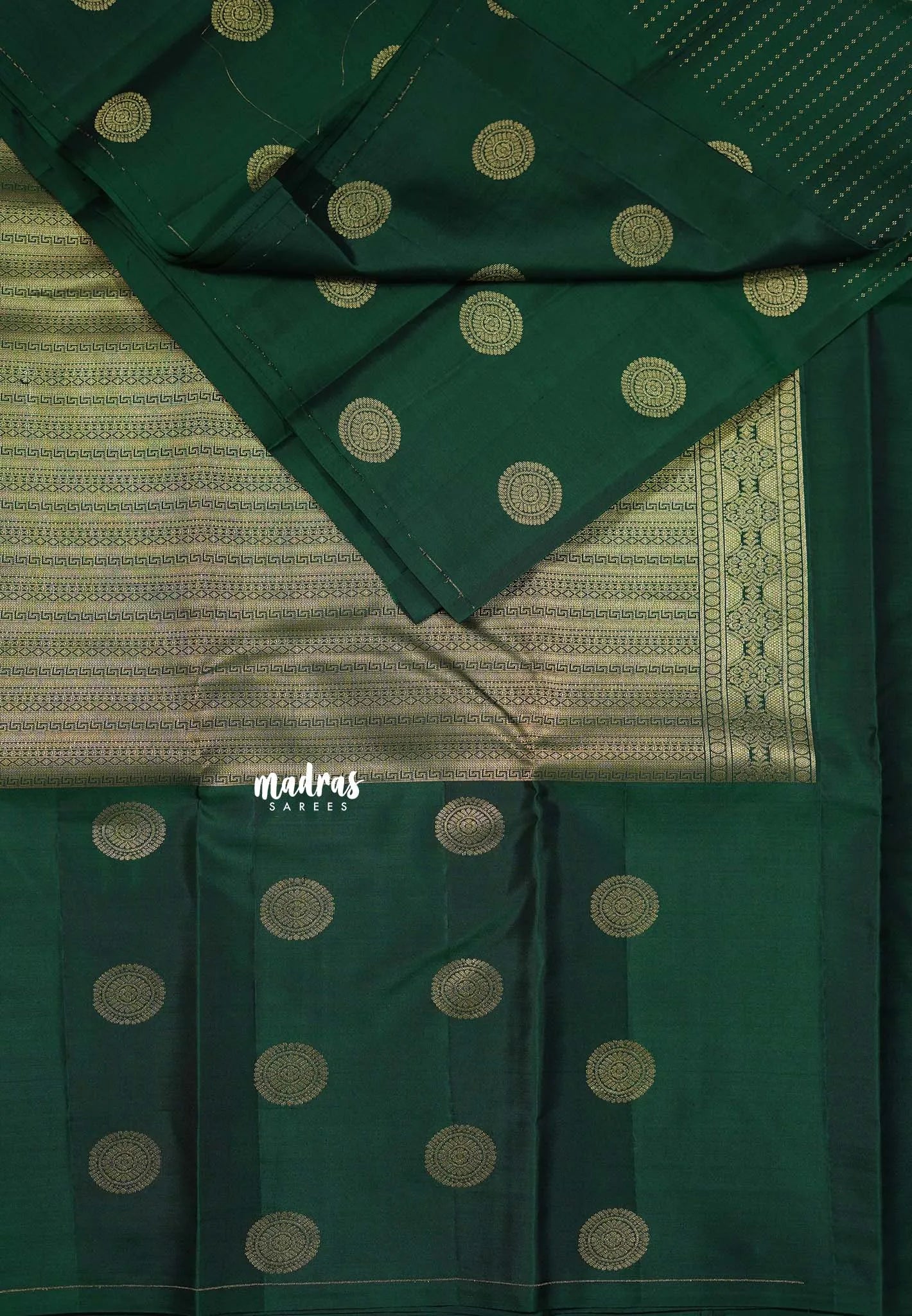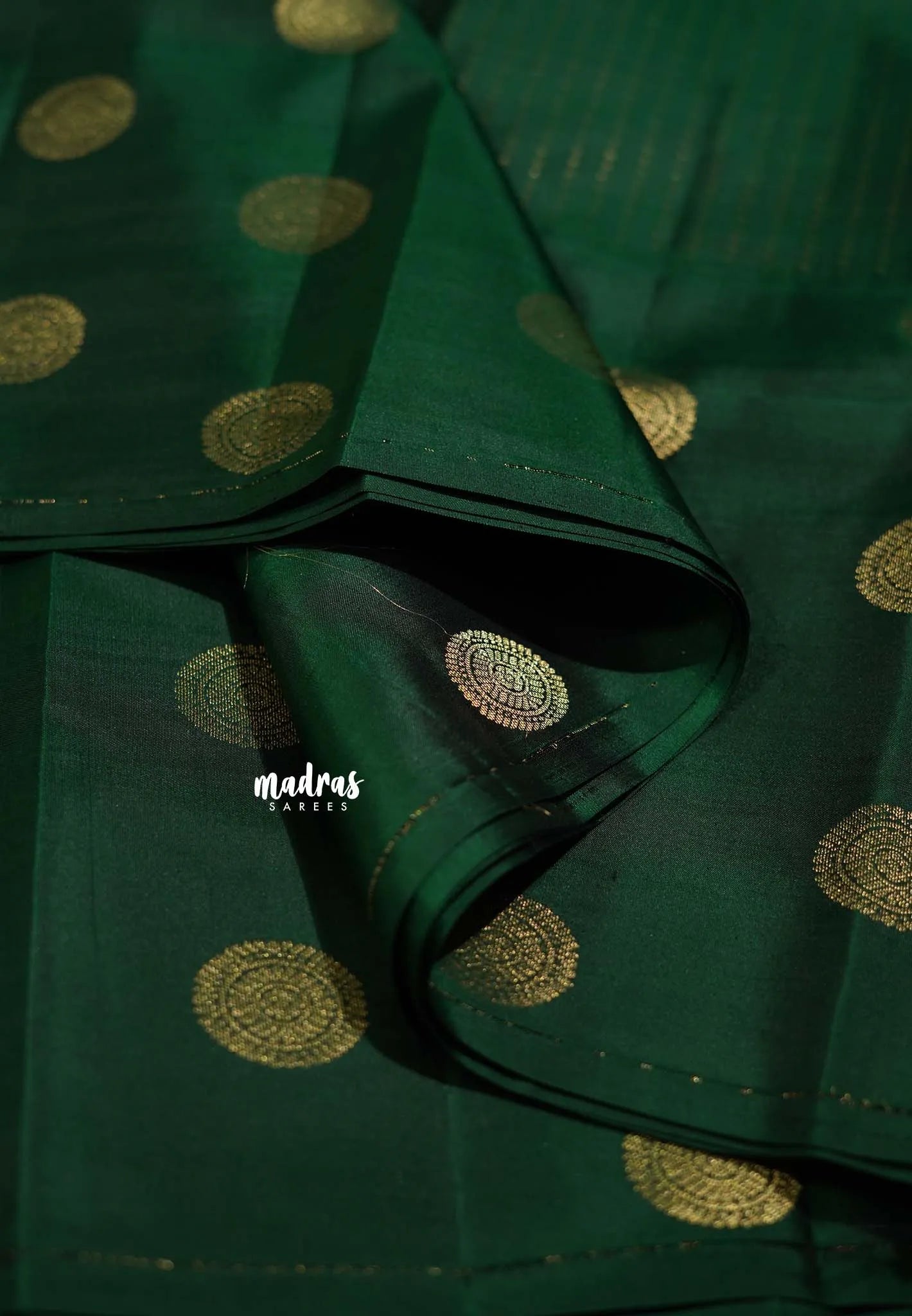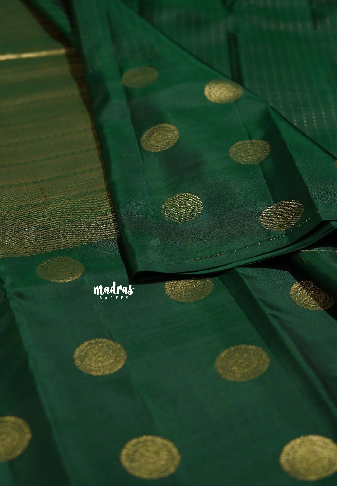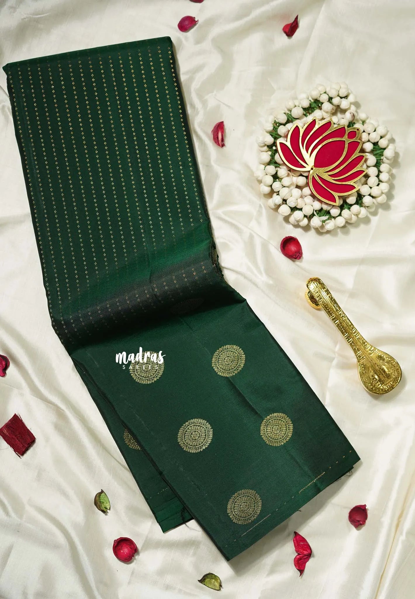 This pure Kanchipuram silk saree showcases a refined and elegant design with a beautifully textured body adorned in fine zari dotted lines, creating a subtle yet striking pattern. The understated detailing adds a graceful rhythm to the weave, making it both classic and versatile.