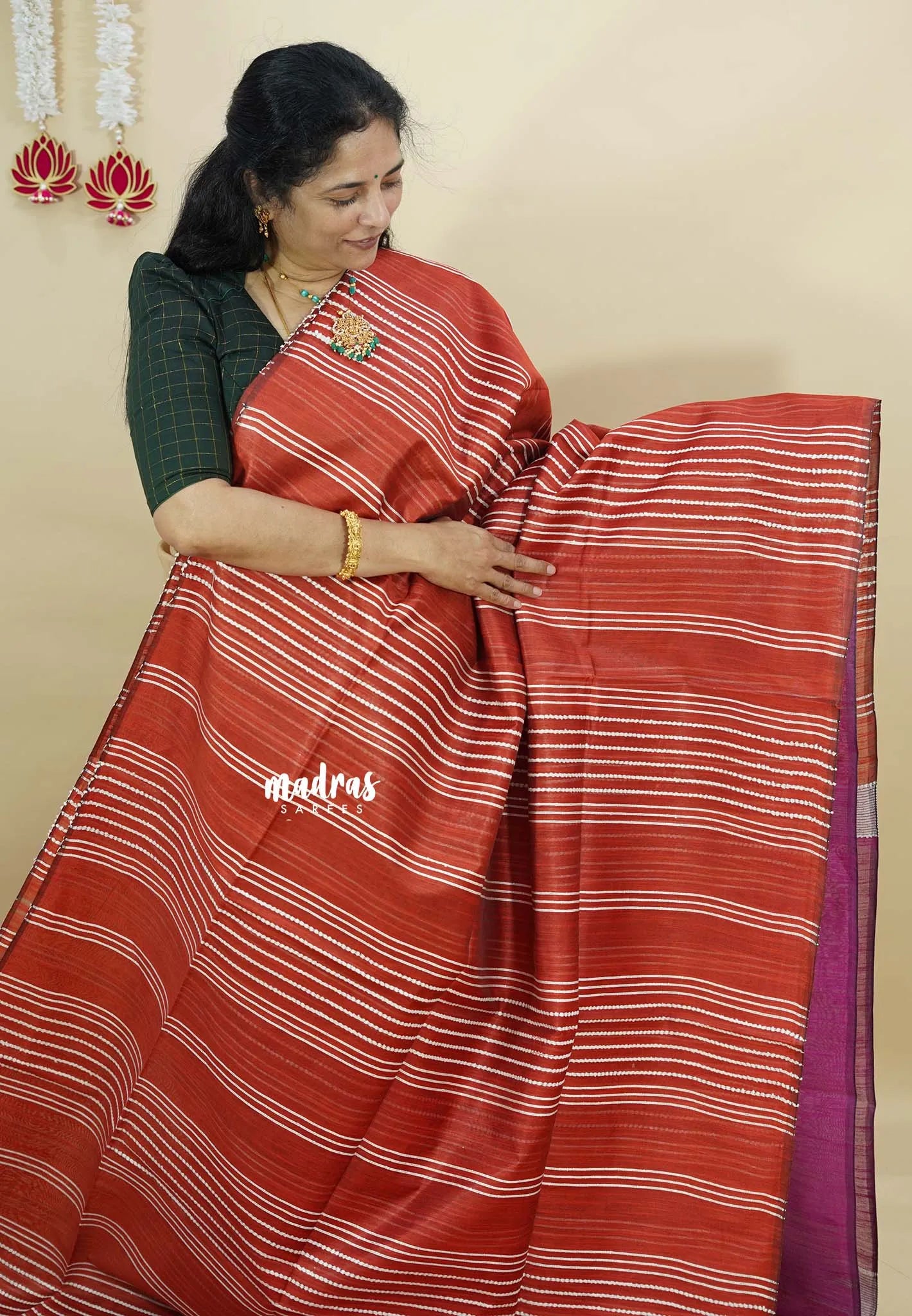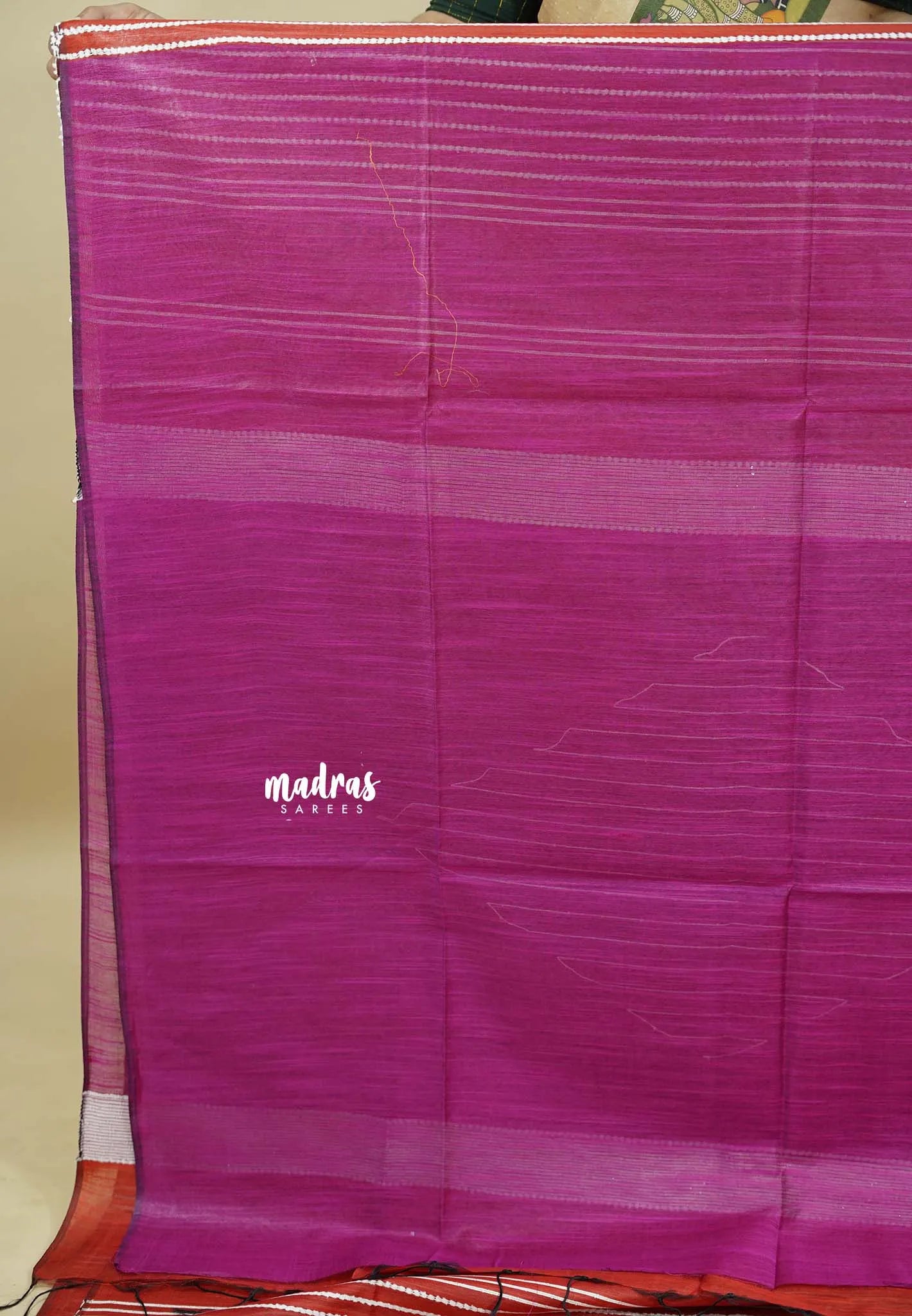 A graceful blend of Jute and Tussar silk, this saree beautifully combines the earthy texture of jute with the subtle sheen of tussar. The fabric drapes effortlessly, offering both comfort and sophistication — perfect for festive and traditional occasions alike..