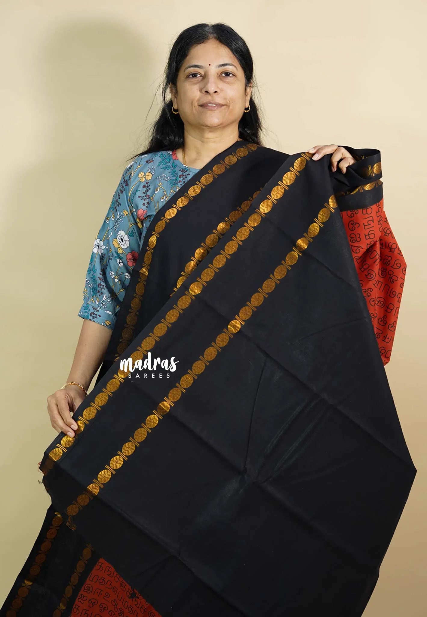 The Mozhi - Sungudi Cotton Saree with a Tamil Letters Rettapet Rudraksham Border beautifully blends tradition and comfort. Made from soft, breathable Sungudi cotton, it features Tamil letters printed across the body, honoring Tamil culture. The saree’s border, inspired by Rudraksha beads, adds elegance with symbolic motifs. Perfect for casual or festive occasions, it combines earthy tones and cultural significance for a stylish, meaningful look.