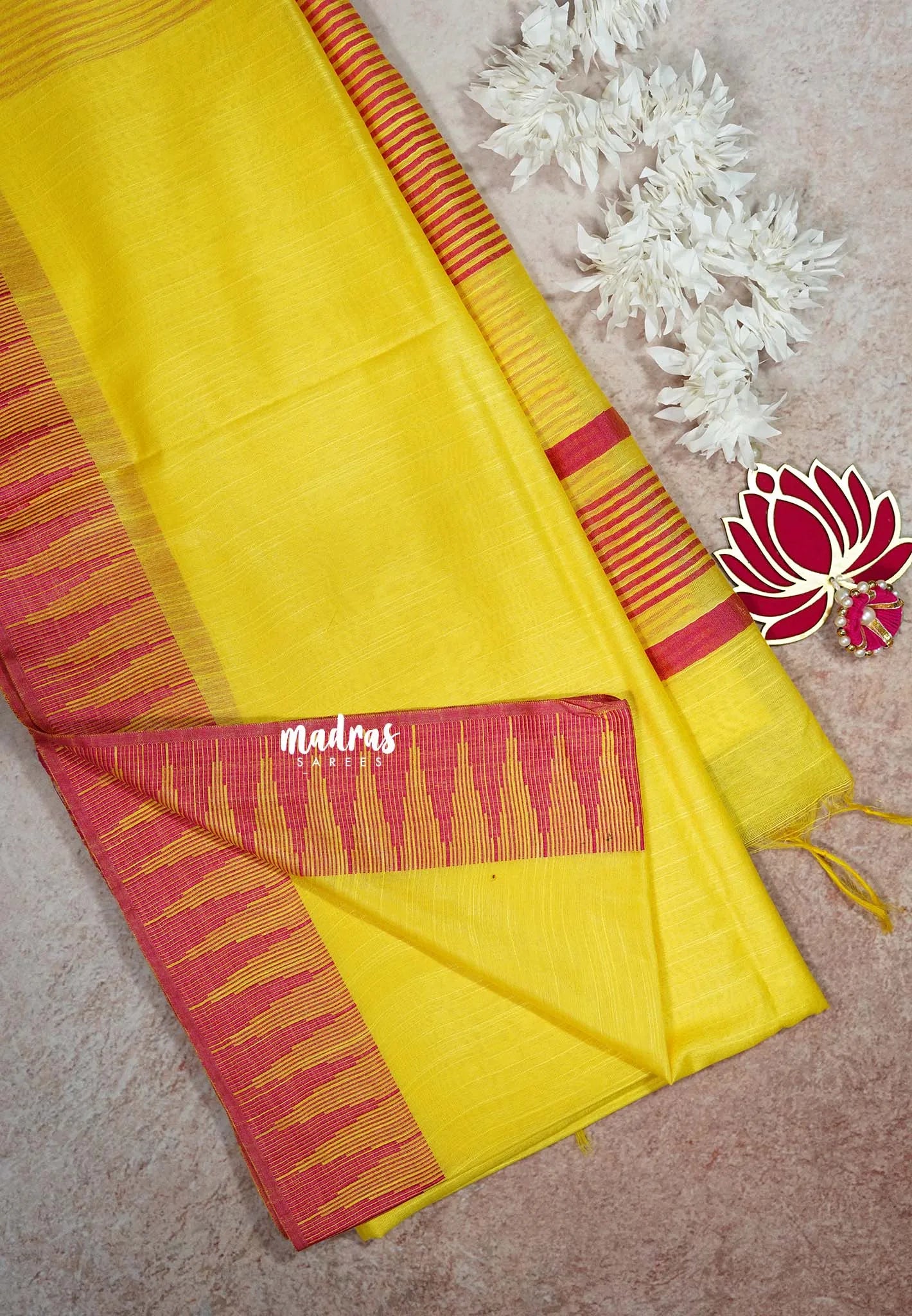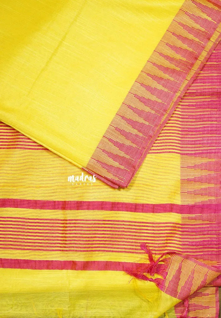 Bright Yellow - Khadi Silk plain saree with Temple Border - Perfect for Regular Wear