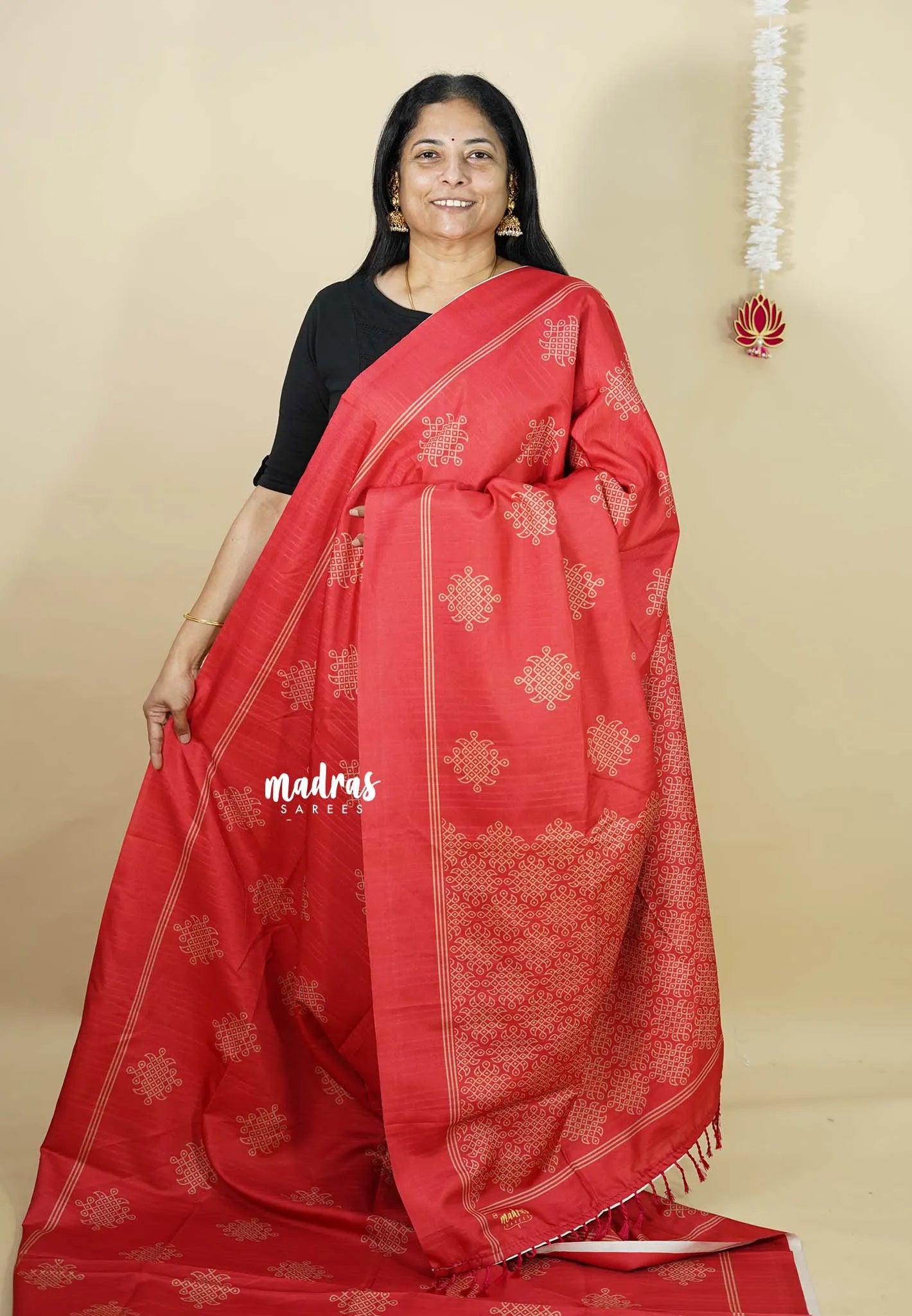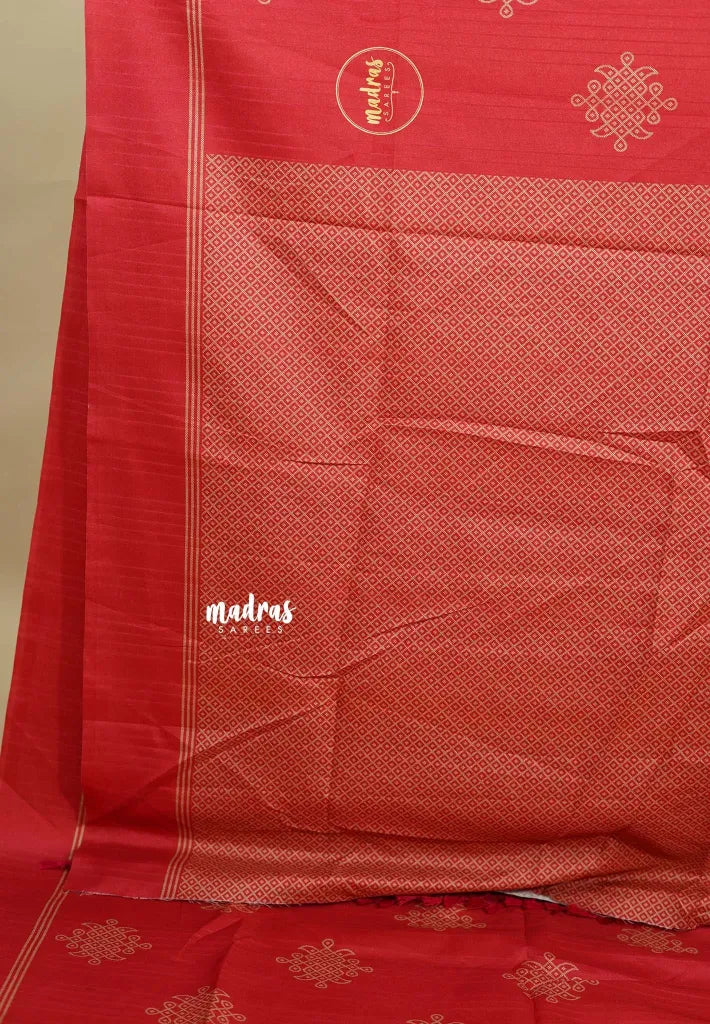 Drape yourself in understated elegance with this Yamini Paper Silk Saree, beautifully adorned with traditional Kolam-inspired woven motifs throughout. The subtle sheen of paper silk enhances the intricate gold thread detailing, while the lightweight texture ensures graceful draping and comfort. Perfect for festive gatherings, temple visits, and special occasions — this saree blends cultural charm with modern sophistication.