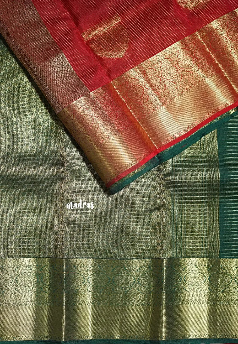 The pallu continues with elaborate zari detailing, complementing the overall design and enhancing its festive appeal. With its combination of structured lines, prominent motifs, and a richly woven border, this saree is perfect for making a graceful and traditional statement.