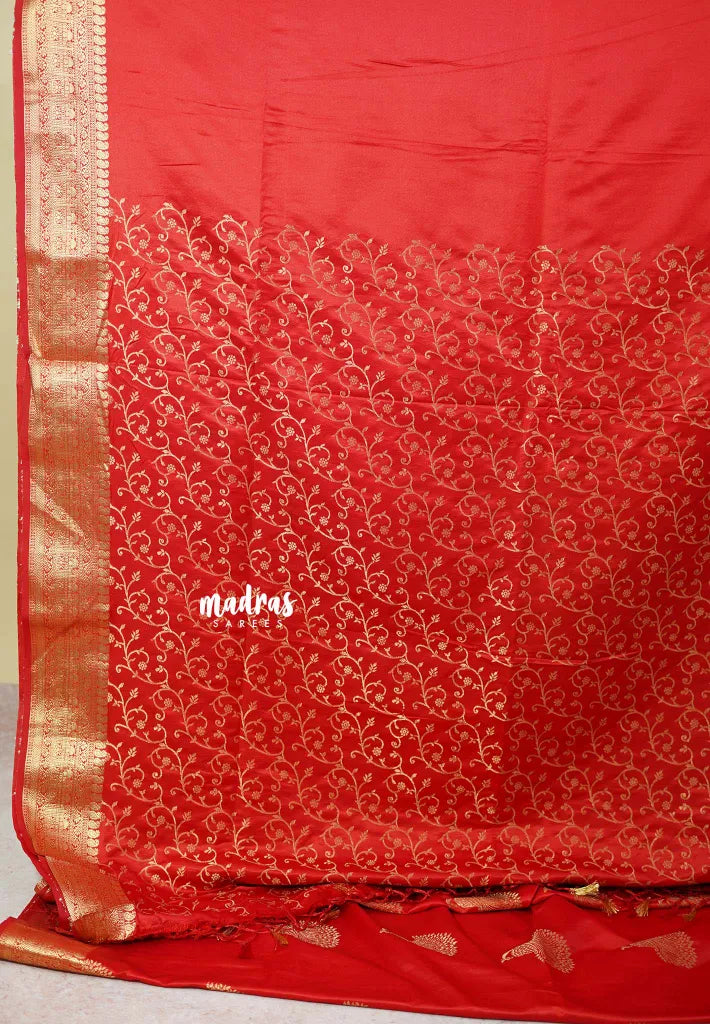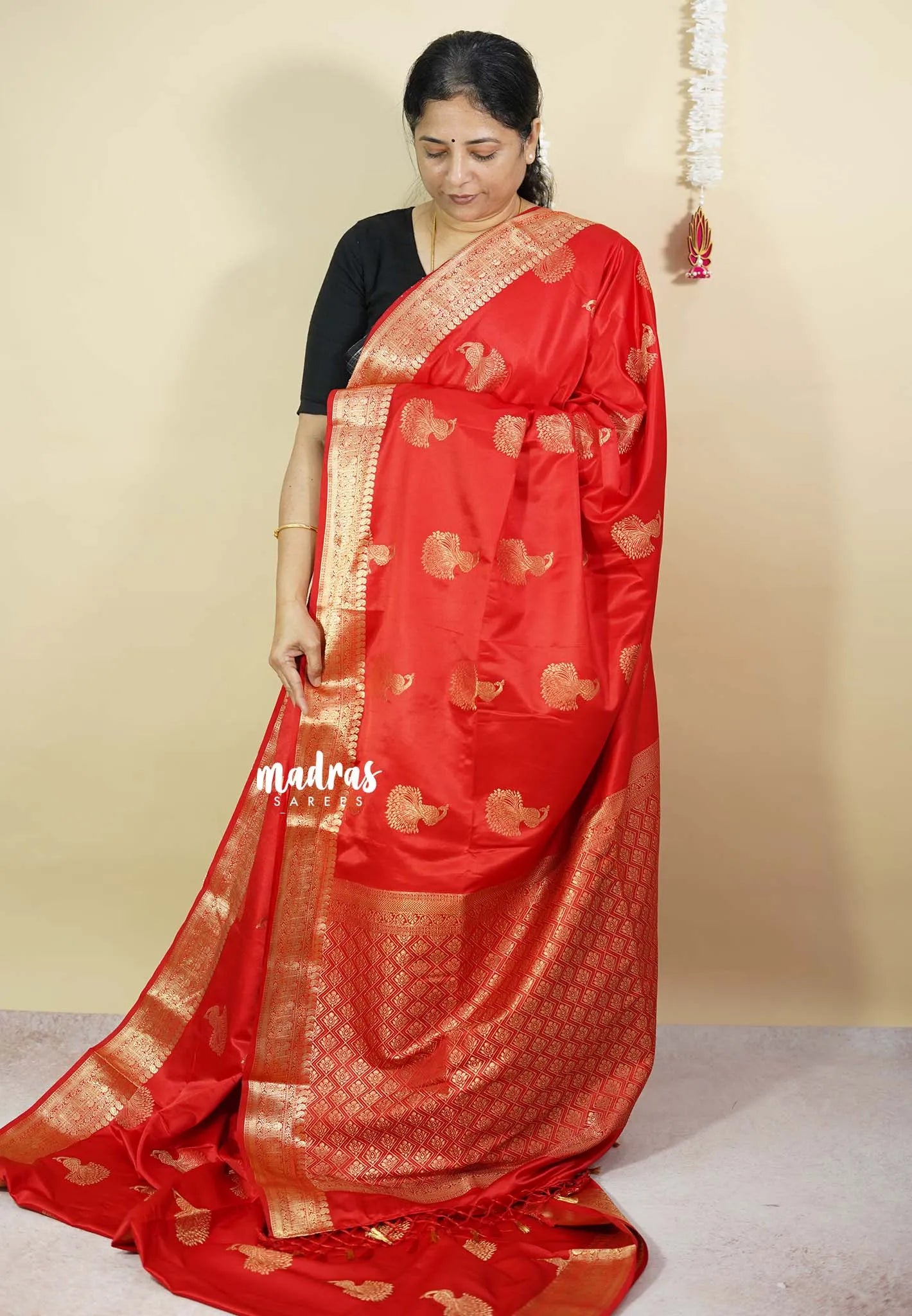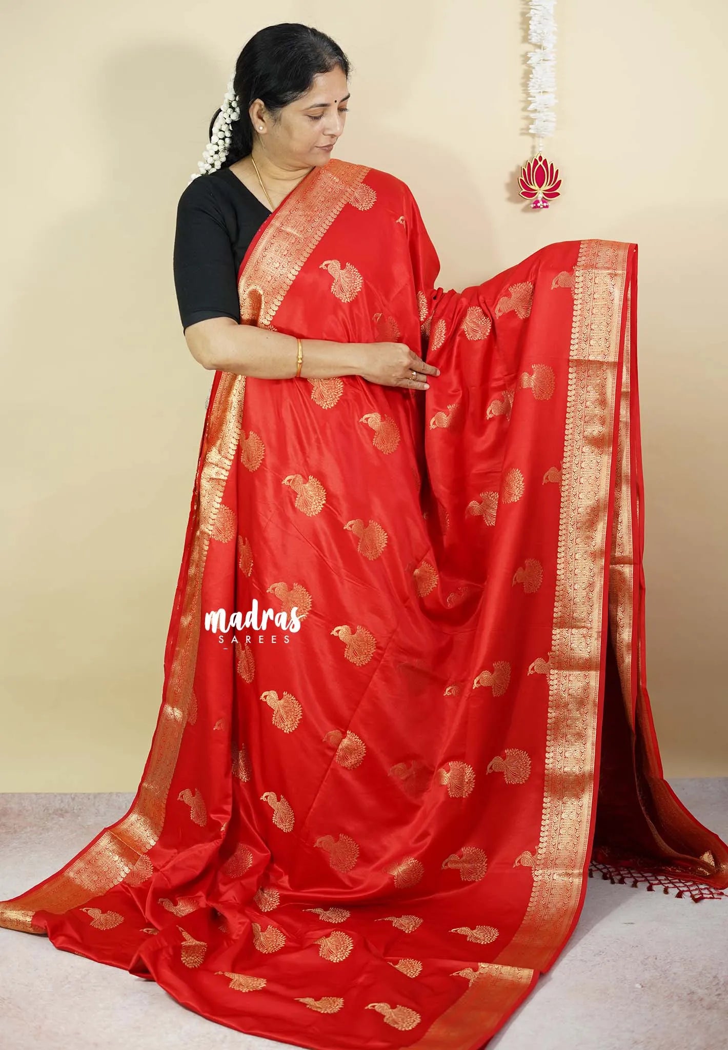 Step into regal elegance with this Srivalli Pure Satin Silk Saree. The saree features intricately woven golden peacock buttas that add a touch of heritage charm, while the luxurious gold zari border and pallu exude grandeur. With its lustrous satin silk texture and timeless motifs, this saree is a perfect choice for weddings, festive occasions, and cultural celebrations.