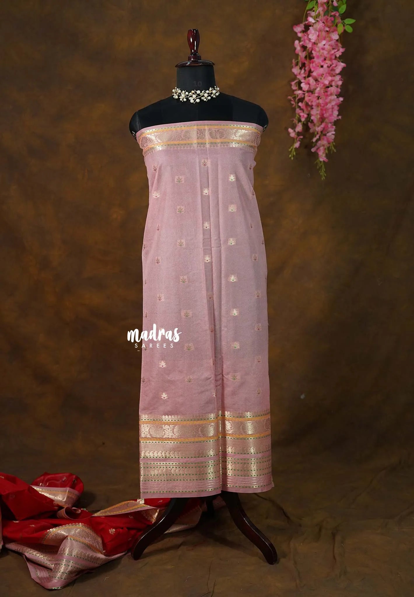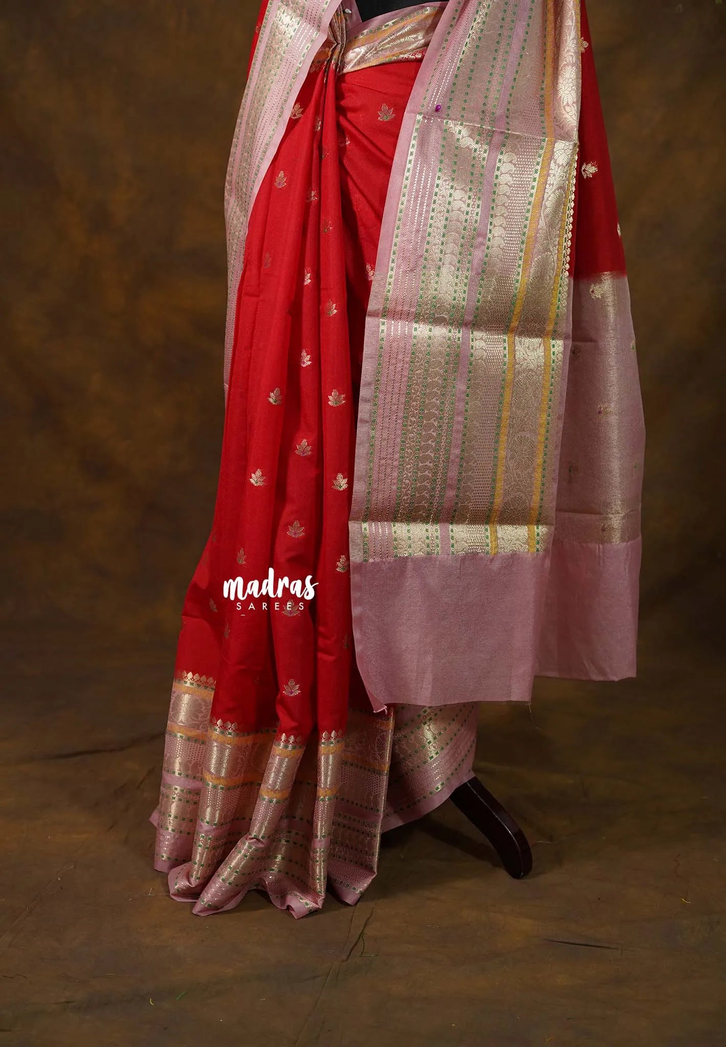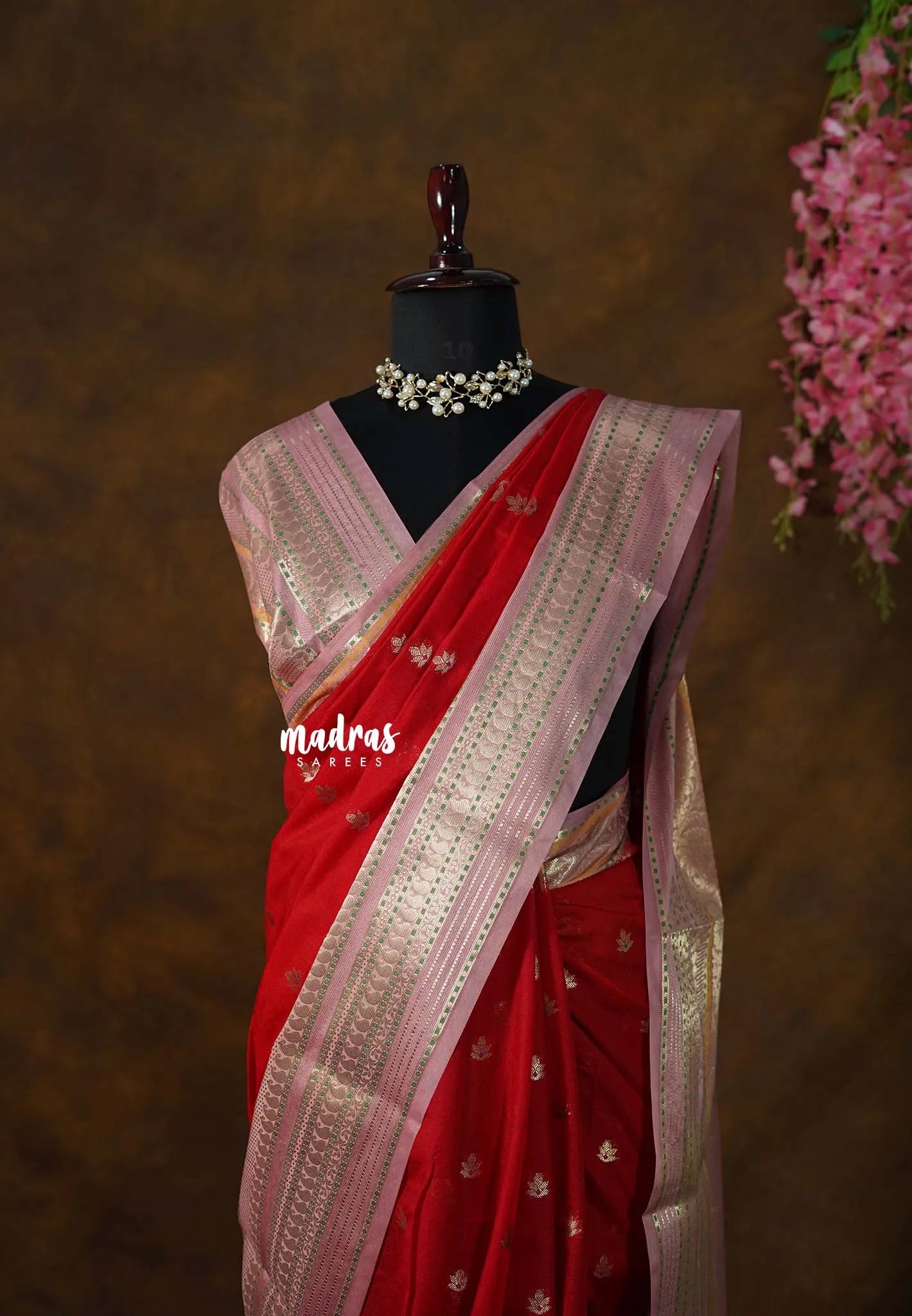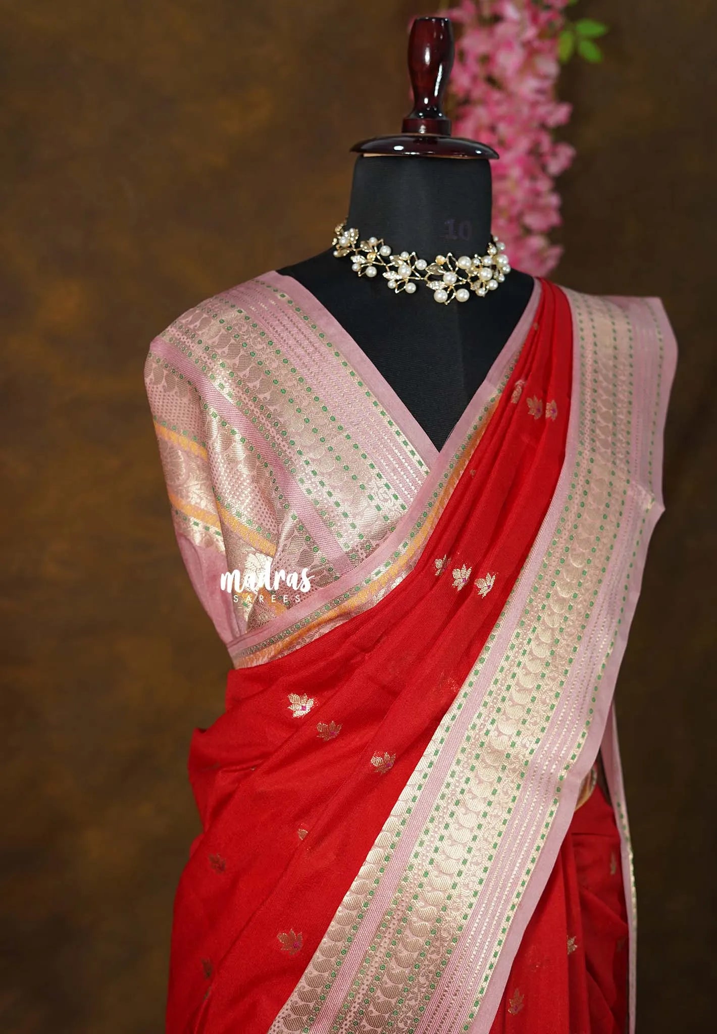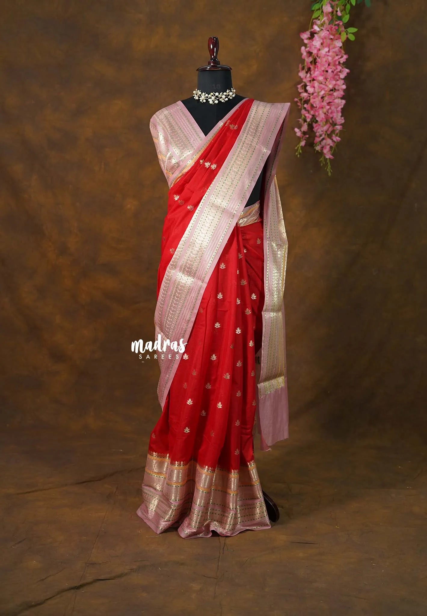 “Durga – A rich Banarasi Katan silk saree featuring elegant zari across the body, complemented by a lustrous border and pallu. A timeless weave that brings grace and grandeur for any occasion.”
