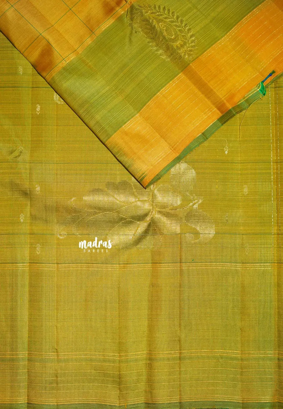 The pallu is elegantly woven with a prominent zari motif, adding depth and a focal point to the saree. With its combination of checks, minimal buttas, and a richly detailed border, this saree is a perfect choice for those who appreciate a blend of simplicity and traditional craftsmanship.