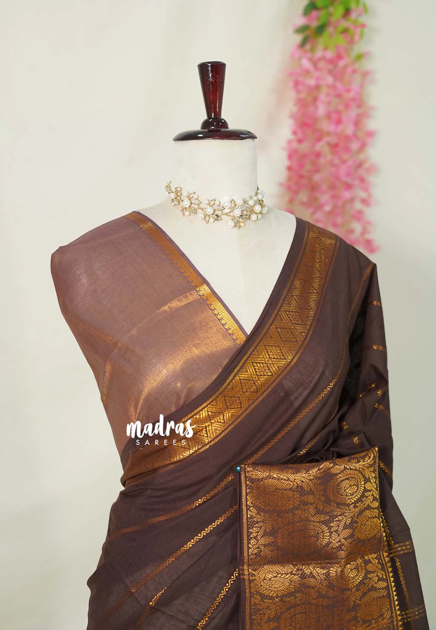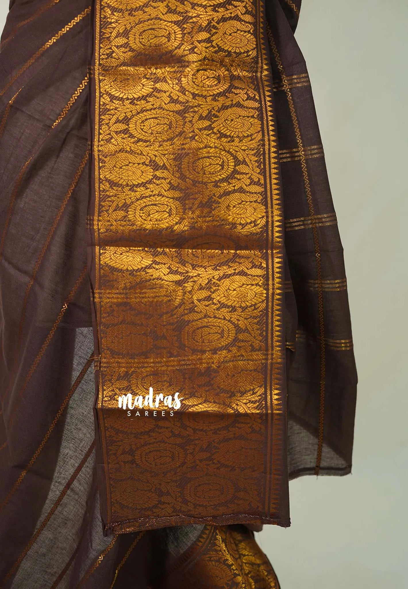 Rooted in heritage craftsmanship, this saree brings together simplicity and sophistication, making it a versatile choice for everyday elegance as well as meaningful occasions. The neat finishing and refined weave highlight the care and attention given to every detail.