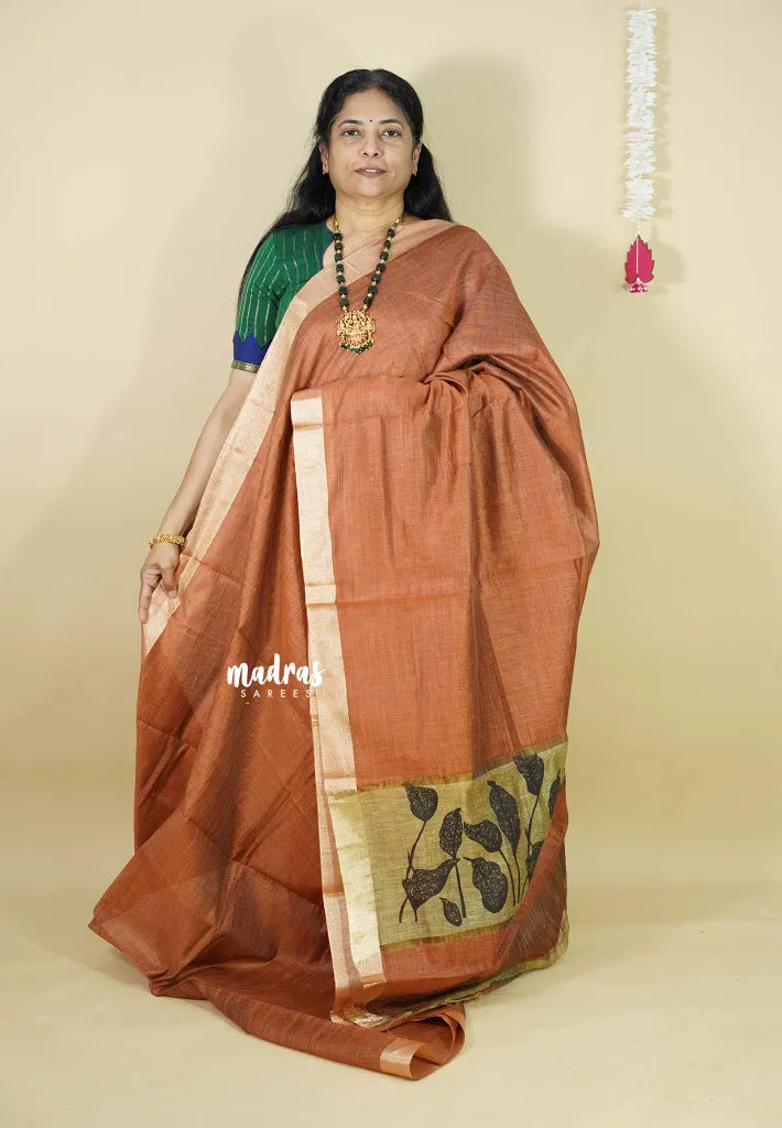 Elevate your festive and ethnic wardrobe with this Handmade Jute Tussar Silk Saree, adorned with timeless handblock prints. The natural texture of jute tussar silk gives a rich and earthy elegance, while the handblock motifs add an artisanal touch. Finished with a lustrous zari border, this saree is a graceful choice for special occasions and cultural celebrations.