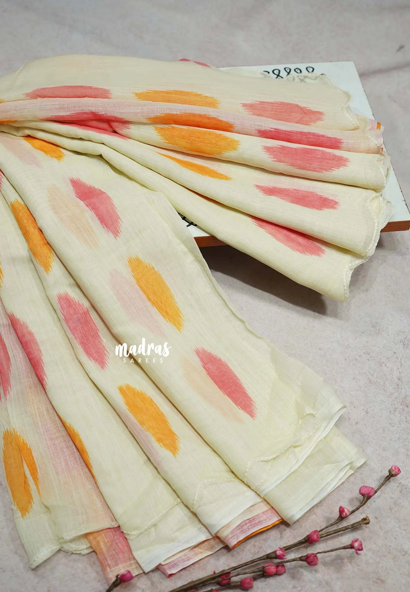 This elegant half-white linen cotton saree features hand-brush patterns in soft peach and orange, finished with a delicate scallop border (saree edge is finished with a curved, wave-) for a graceful touch. Paired with an embroidered blouse, it brings effortless charm and sophistication.