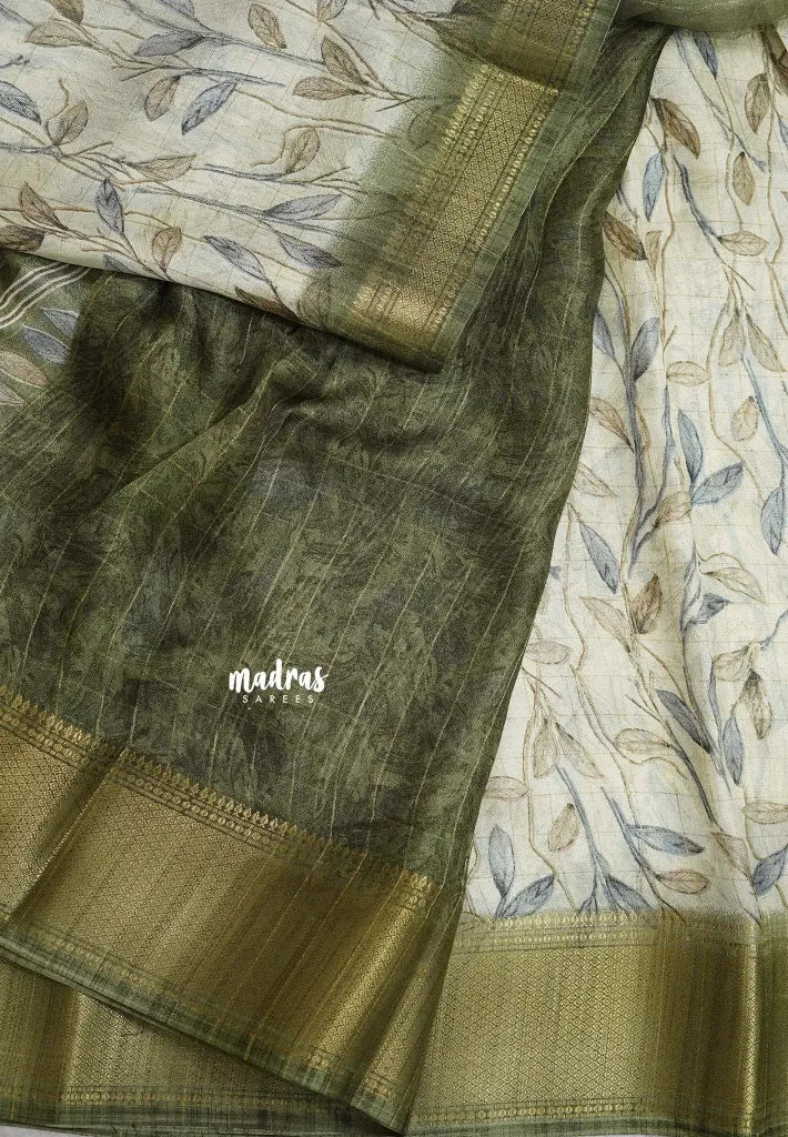 Exquisite leaf-printed silk saree featuring a deep, regal base adorned with blooming pastel leaf. Its gold zari border adds a striking touch of opulence, making it perfect for elegant occasions.