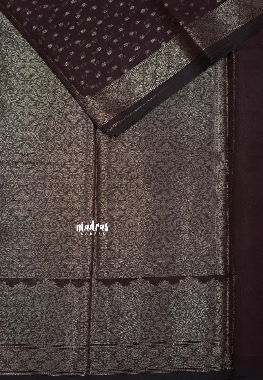 “Durga – A rich Banarasi semi silk saree featuring elegant zari across the body, complemented by a lustrous border and pallu. A timeless weave that brings grace and grandeur for any occasion.”