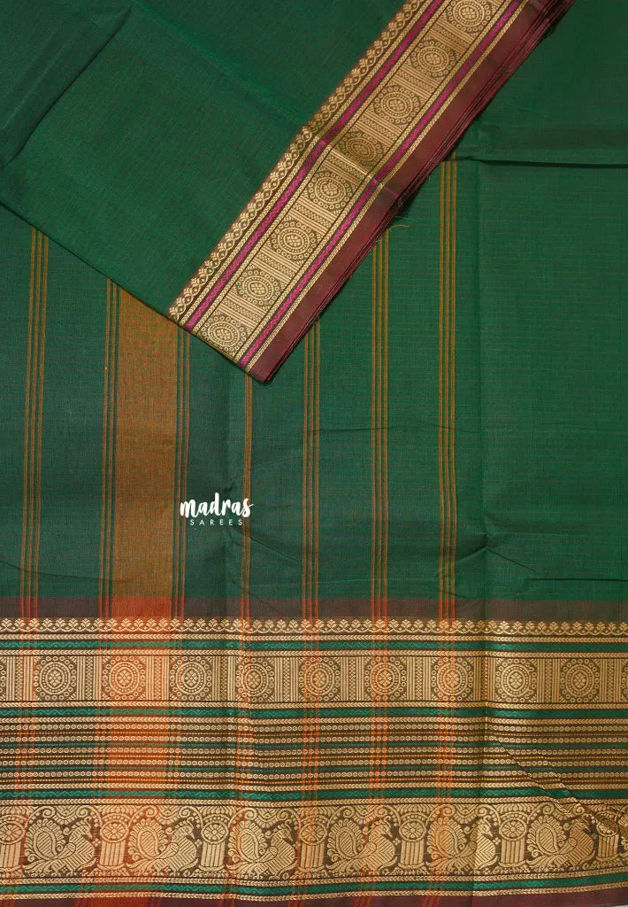 Dark Green - Karthigai silk cotton chettinad lines thread weaving multi border - Best for Wedding Functions