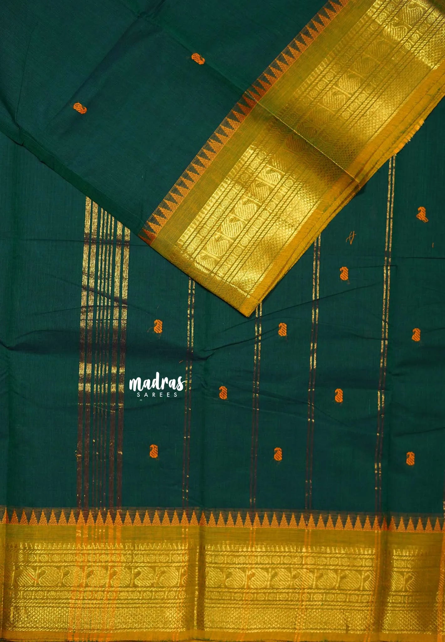Dark Green - Karthigai silk cotton Saree Bavanji and Mango border with buttas - Best for Wedding Functions