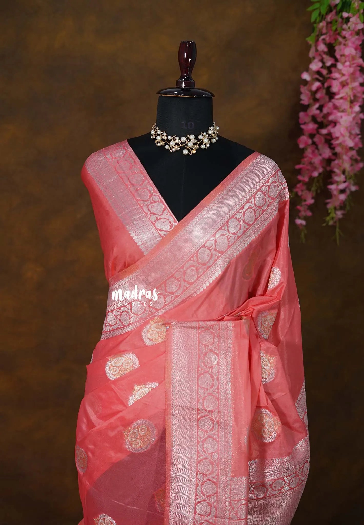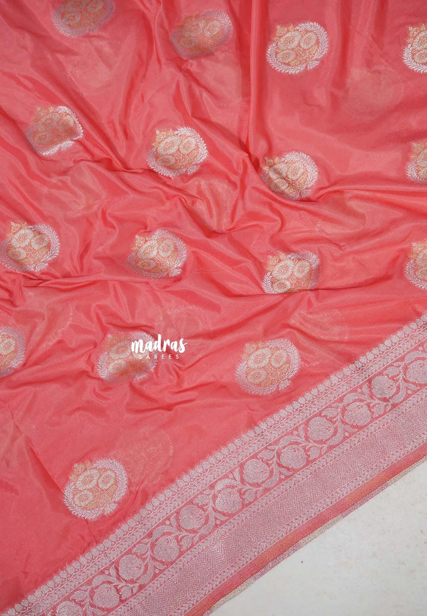 Dark Peach - Banarasi Chinon Silk with Floral Border - Best for Night Functions