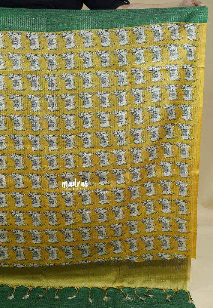 Inspired by the rich heritage of Pichwai art, this Sundari Kota Tussar Saree showcases intricate cow motifs printed on the pallu and blouse — a symbol of grace and divinity. The saree features a textured checked body in elegant grey tones paired with a vibrant pallu, creating a perfect fusion of tradition and contemporary style.
